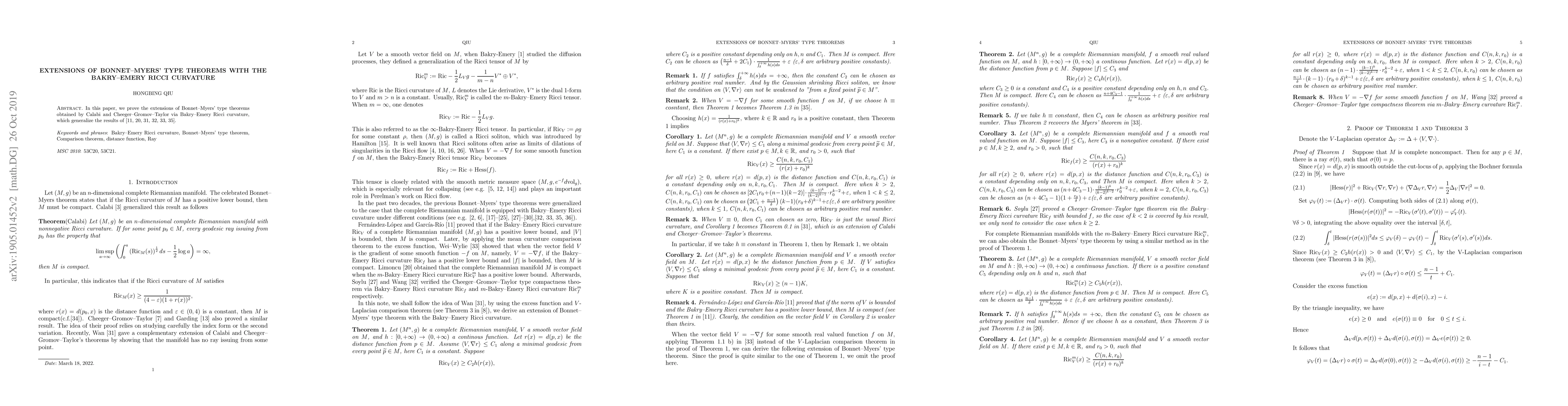 Summary: This paper extends Bonnet-Myers theorems using Bakry-Emery Ricci curvature, generalizing previous results from \cite{FG, Lim1, Wan, Wang, WW, Wu} obtained by Calabi and Cheeger-Gromov-Taylor. The focus is on applying this curvature to refine and extend classical geometric results.