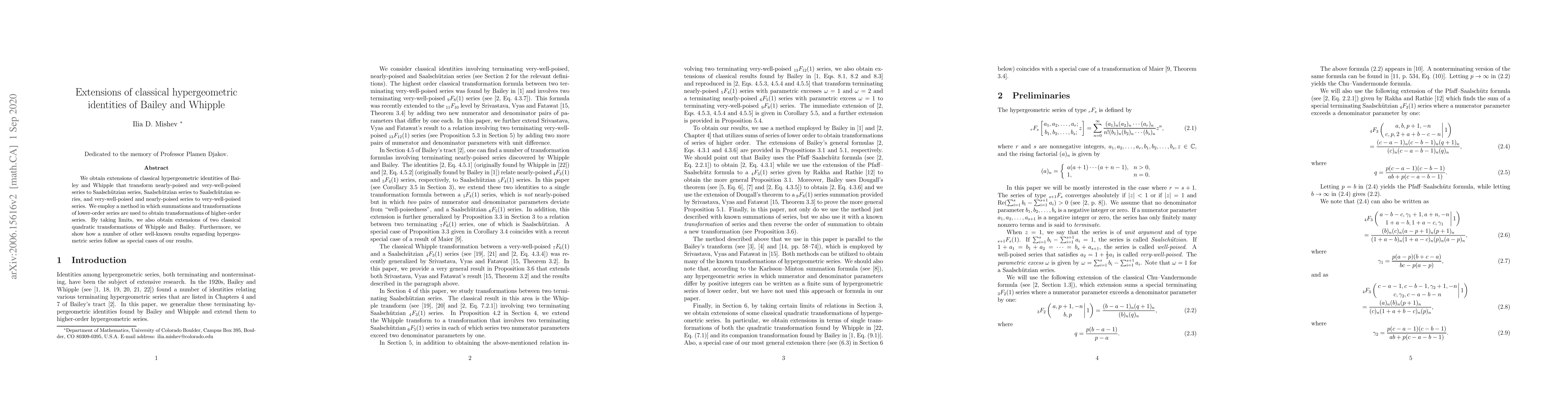 This paper extends classical hypergeometric identities by transforming nearly-poised and very-well-poiseed series into Saalsch\"utzian series and vice versa, using summations and transformations of lower-order series. It also extends classical quadratic transformations of Whipple and Bailey through limits and demonstrates that many known hypergeometric results are special cases of the new findings.