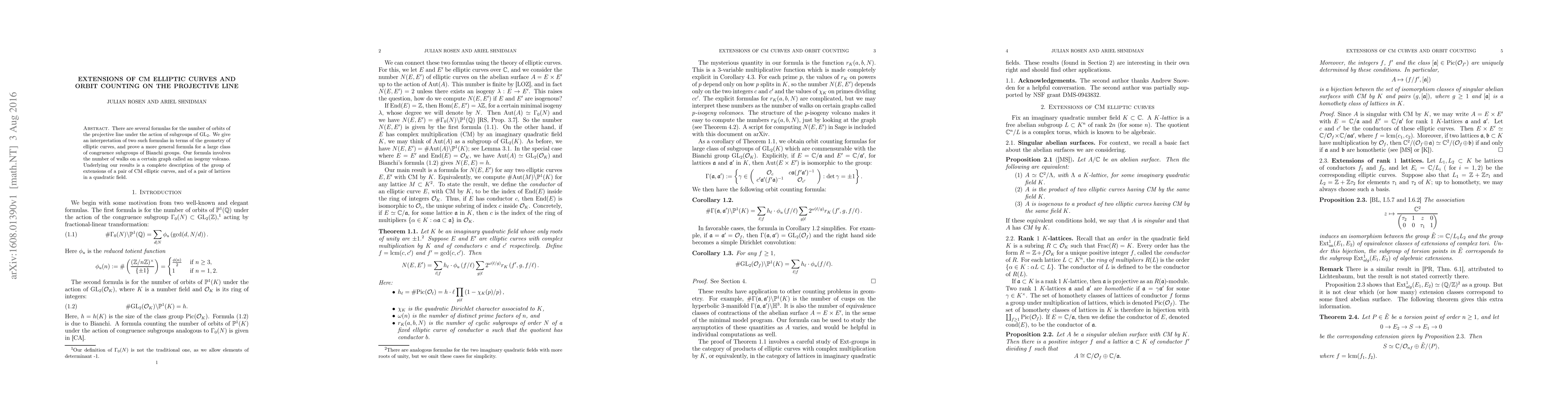 There are several formulas for the number of orbits of the projective line under the action of subgroups of $GL_2$. We give an interpretation of two such formulas in terms of the geometry of elliptic curves, and prove a more general formula for a large class of congruence subgroups of Bianchi groups. Our formula involves the number of walks on a certain graph called an isogeny volcano. Underlying our results is a complete description of the group of extensions of a pair of CM elliptic curves, and of a pair of lattices in a quadratic field.