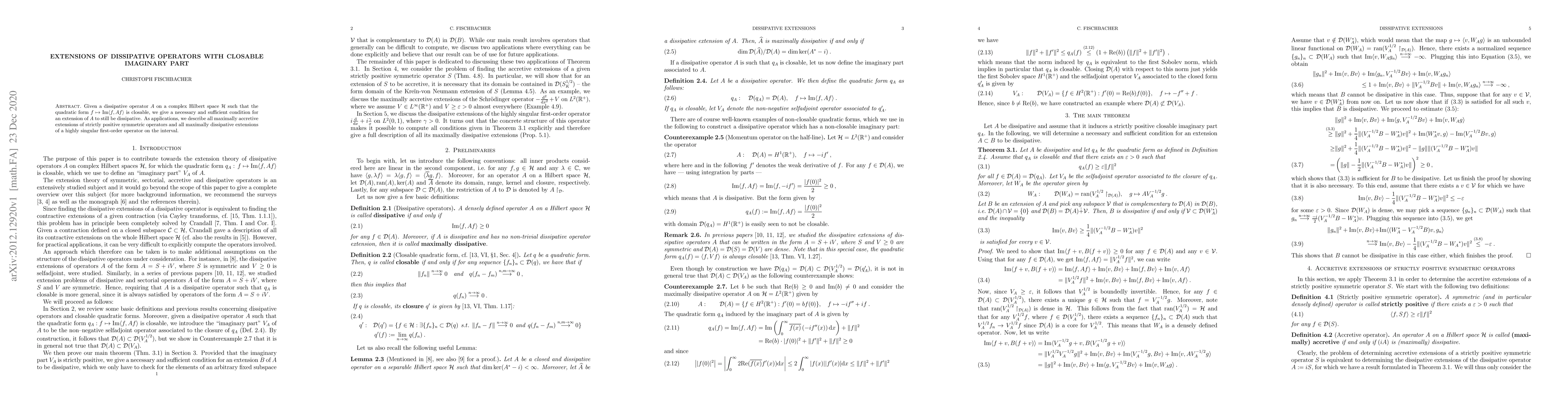 Given a dissipative operator $A$ on a complex Hilbert space $\mathcal{H}$ such that the quadratic form $f\mapsto \mbox{Im}\langle f,Af\rangle$ is closable, we give a necessary and sufficient condition for an extension of $A$ to still be dissipative. As applications, we describe all maximally accretive extensions of strictly positive symmetric operators and all maximally dissipative extensions of a highly singular first-order operator on the interval.