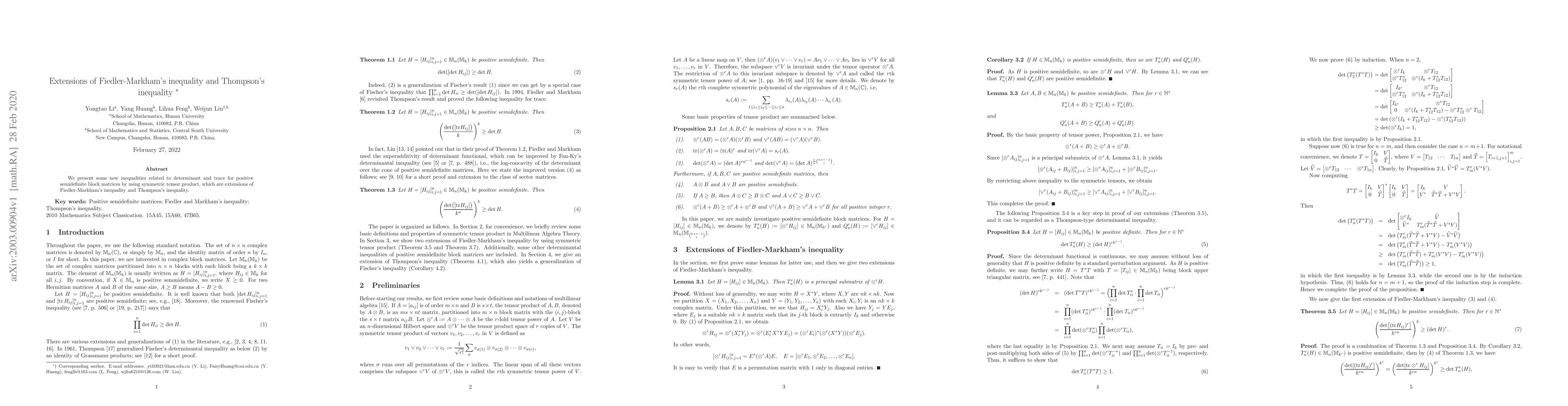 This paper introduces new inequalities for positive semidefinite block matrices, extending Fiedler-Markham's and Thompson's inequalities using symmetric tensor products, focusing on determinant and trace properties.
