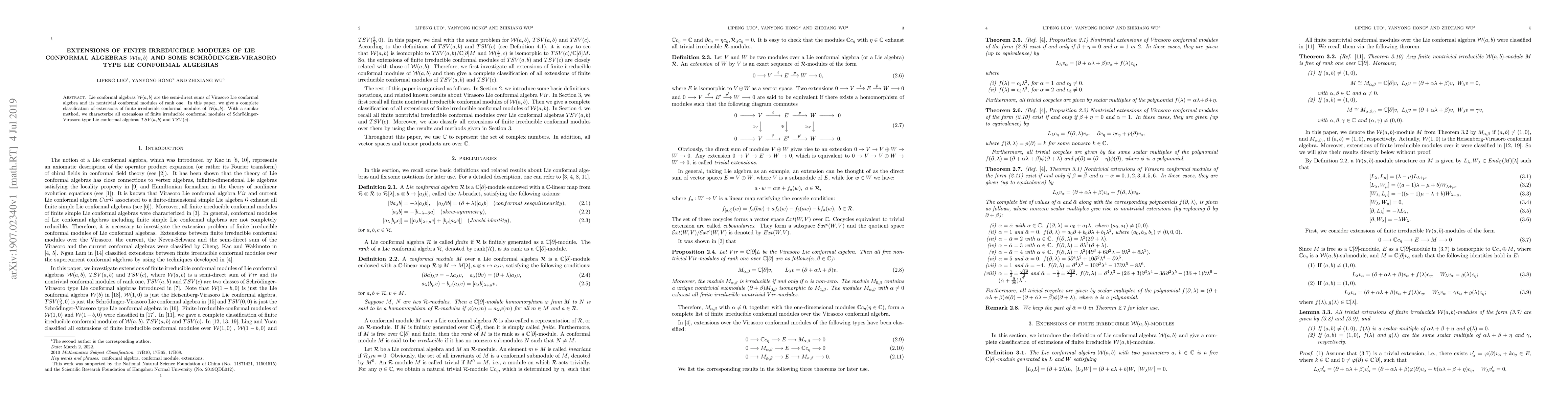 This paper classifies the extensions of finite irreducible modules for Lie conformal algebras $\mathcal{W}(a,b)$ and characterizes the extensions for Schrödinger-Virasoro type algebras $TSV(a,b)$ and $TSV(c)$ using a unified method.