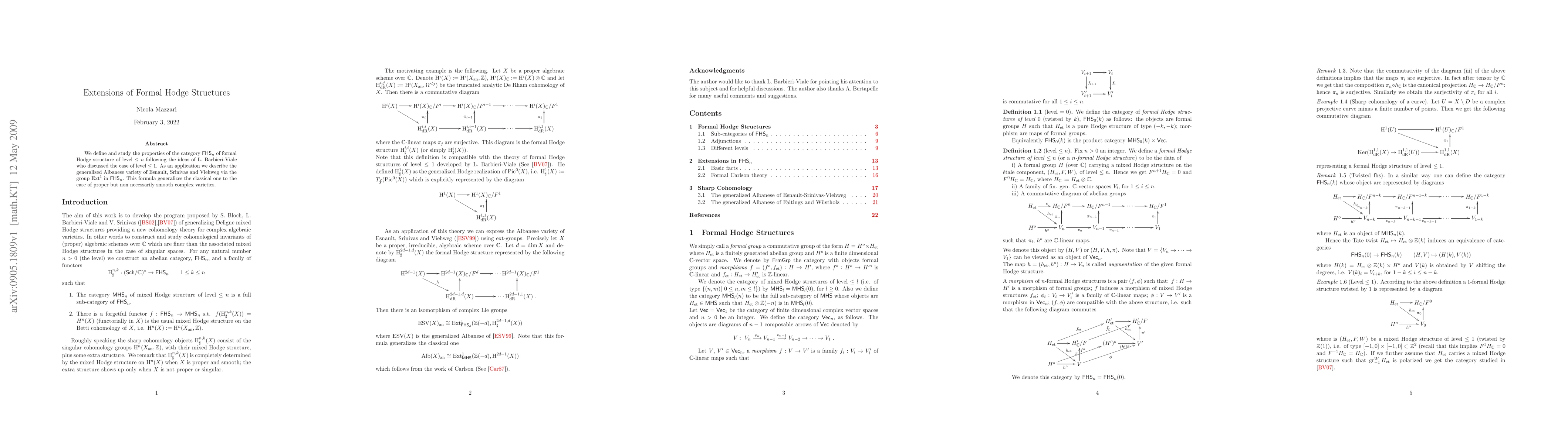 This paper defines and explores the category ${\sf FHS}_n$ of formal Hodge structures up to level $n$, extending previous work by Barbieri-Viale. It applies this framework to describe the generalized Albanese variety using $\Ext^1$ in ${\sf FHS}_n$, extending classical results to non-smooth complex varieties.