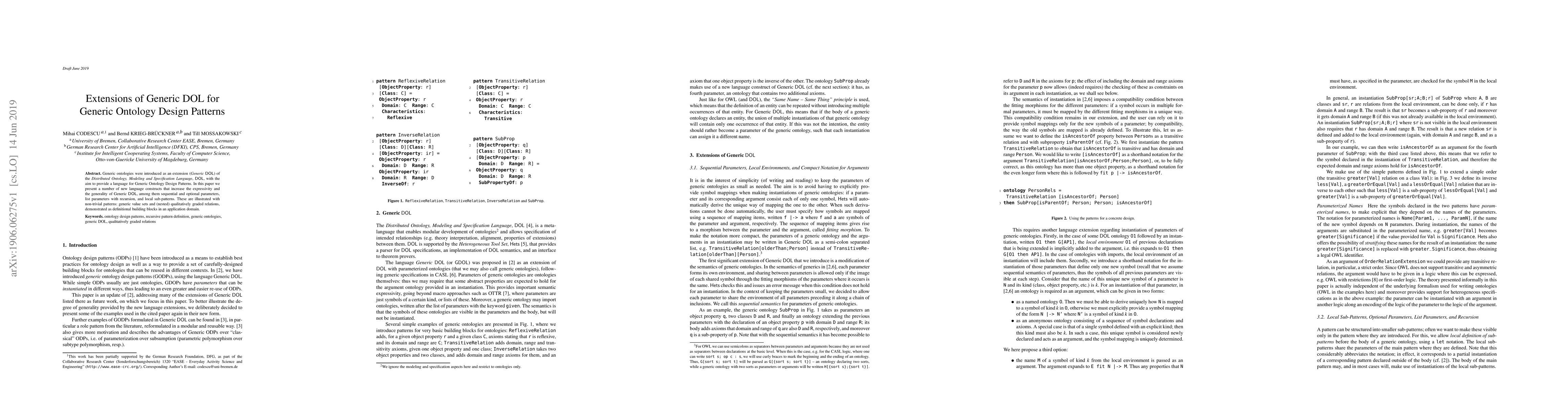 This paper extends Generic DOL, an ontology language based on DOL, to enhance its expressivity and generality with new constructs like sequential and optional parameters, list parameters with recursion, and local sub-patterns. These extensions are demonstrated through complex patterns such as generic value sets and nested qualitatively graded relations in an application domain.