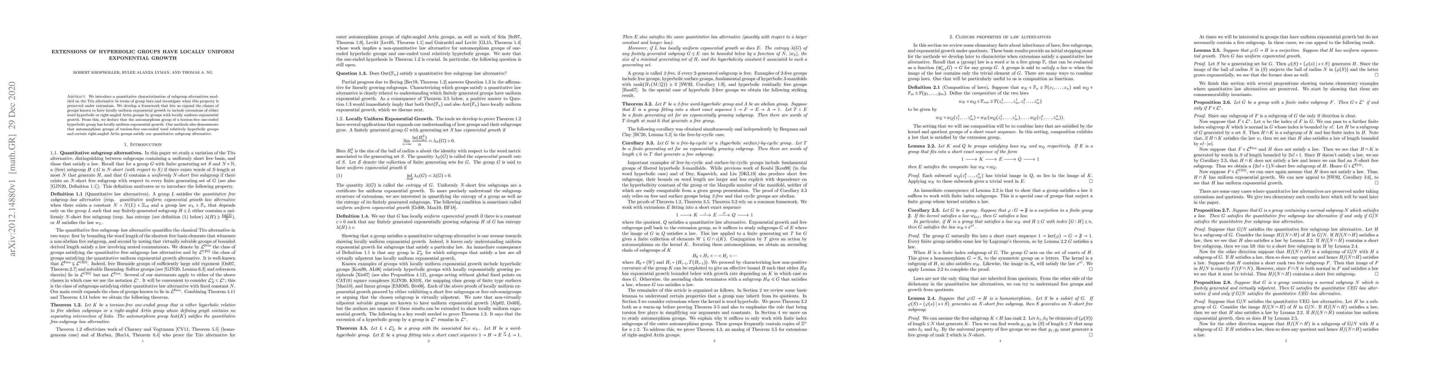 We introduce a quantitative characterization of subgroup alternatives modeled on the Tits alternative in terms of group laws and investigate when this property is preserved under extensions. We develop a framework that lets us expand the classes of groups known to have locally uniform exponential growth to include extensions of either word hyperbolic or right-angled Artin groups by groups with locally uniform exponential growth. From this, we deduce that the automorphism group of a torsion-free one-ended hyperbolic group has locally uniform exponential growth. Our methods also demonstrate that automorphism groups of torsion-free one-ended toral relatively hyperbolic groups and certain right-angled Artin groups satisfy our quantitative subgroup alternative.