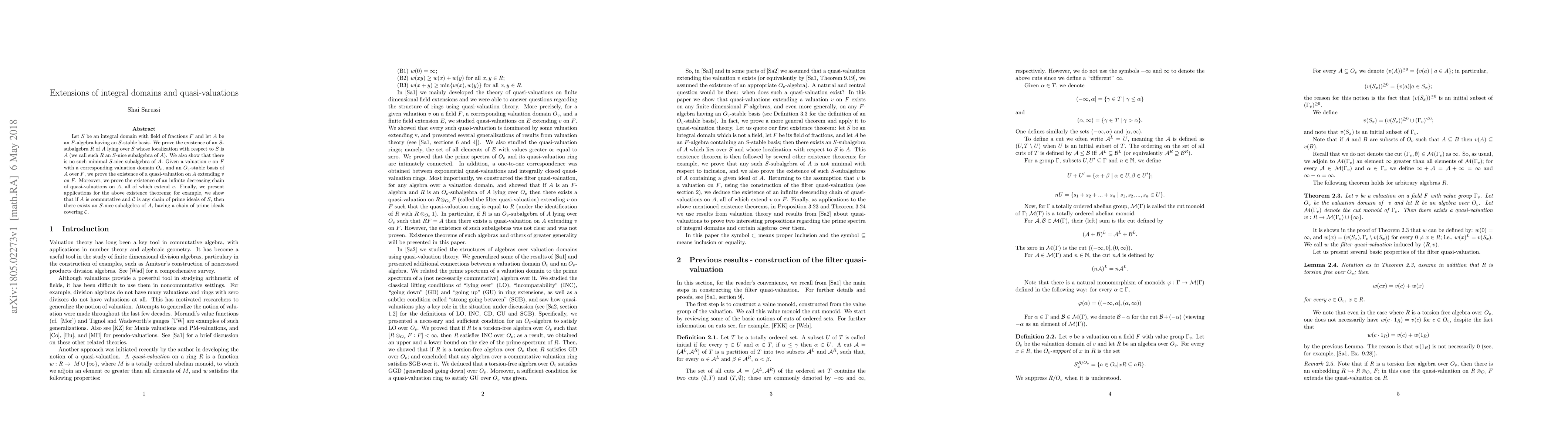 Let $S$ be an integral domain with field of fractions $F$ and let $A$ be an $F$-algebra having an $S$-stable basis. We prove the existence of an $S$-subalgebra $R$ of $A$ lying over $S$ whose localization with respect to $S$ is $A$ (we call such $R$ an $S$-nice subalgebra of $A$). We also show that there is no such minimal $S$-nice subalgebra of $A$. Given a valuation $v$ on $F$ with a corresponding valuation domain $O_v$, and an $O_v$-stable basis of $A$ over $F$, we prove the existence of a quasi-valuation on $A$ extending $v$ on $F$. Moreover, we prove the existence of an infinite decreasing chain of quasi-valuations on $A$, all of which extend $v$. Finally, we present applications for the above existence theorems; for example, we show that if $A$ is commutative and $\mathcal C$ is any chain of prime ideals of $S$, then there exists an $S$-nice subalgebra of $A$, having a chain of prime ideals covering $\mathcal C$.