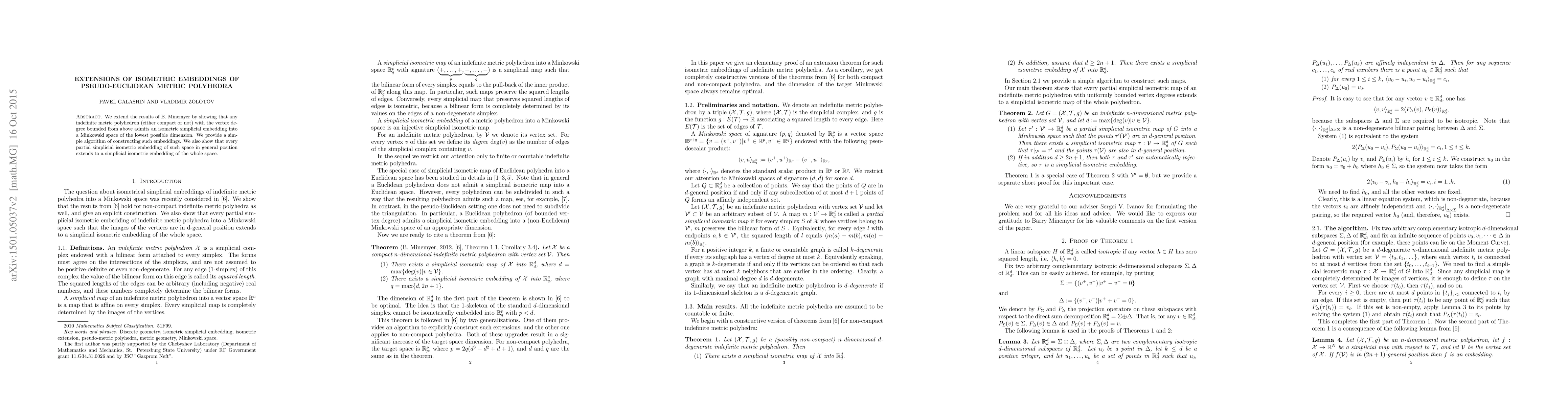 This paper extends B. Minemyer's results to indefinite metric polyhedra, proving they can be isometrically embedded into Minkowski space with minimal dimension. It also presents an algorithm for constructing such embeddings and demonstrates that partial embeddings can be extended to full embeddings.