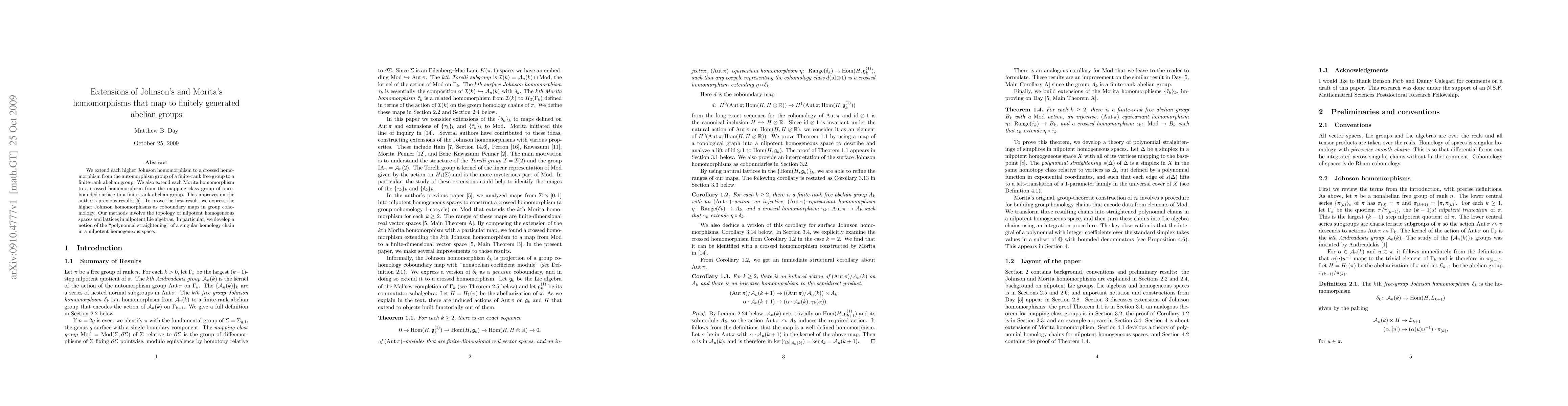 This paper extends higher Johnson and Morita homomorphisms to crossed homomorphisms mapping to finite-rank abelian groups, improving on prior results. The proofs leverage group cohomology, topology of nilpotent spaces, and the concept of "polynomial straightening" of singular homology chains.