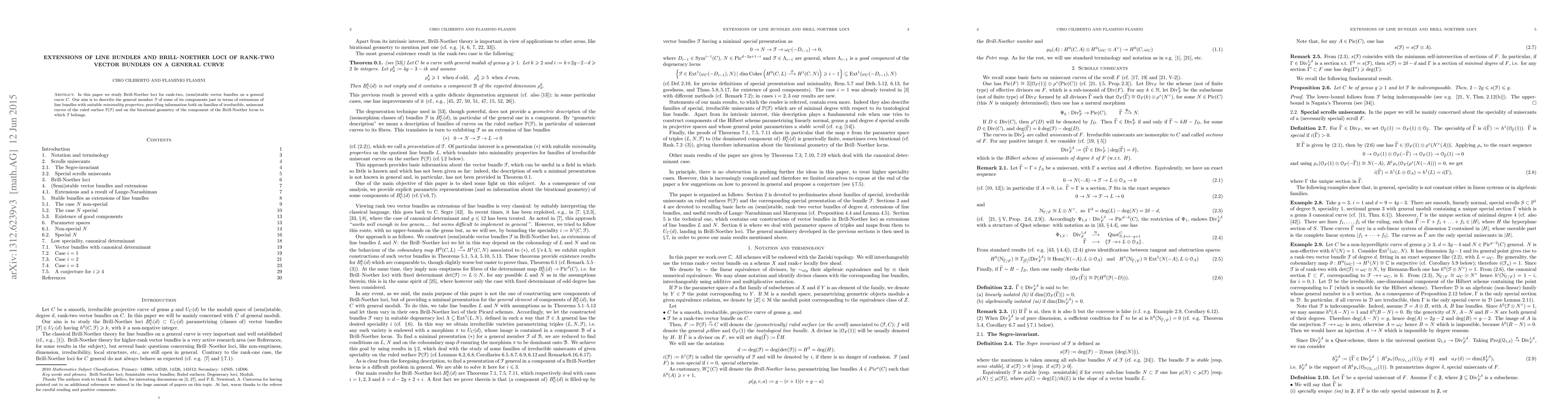 This paper investigates Brill-Noether loci for rank-two vector bundles on general curves, identifying general members of specific components as extensions of line bundles.