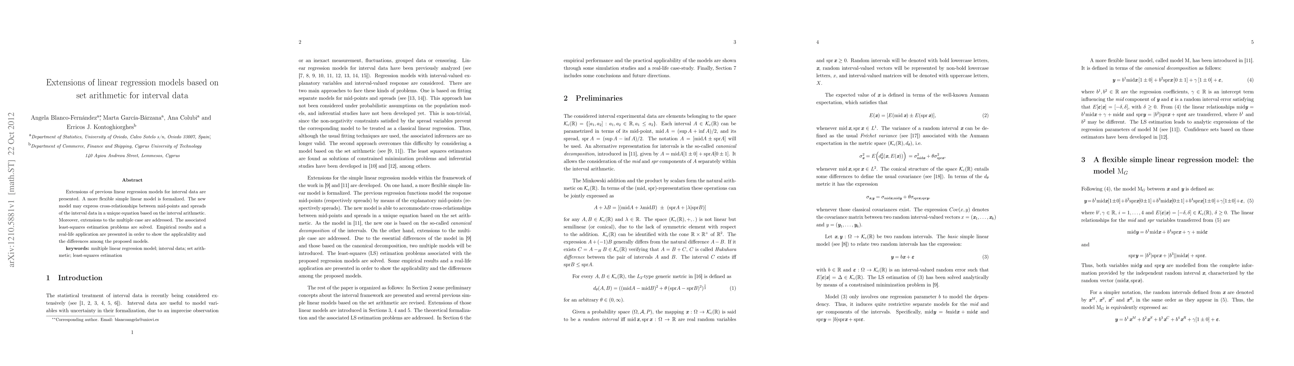 Extensions of previous linear regression models for interval data are presented. A more flexible simple linear model is formalized. The new model may express cross-relationships between mid-points and spreads of the interval data in a unique equation based on the interval arithmetic. Moreover, extensions to the multiple case are addressed. The associated least-squares estimation problem are solved. Empirical results and a real-life application are presented in order to show the applicability and the differences among the proposed models.