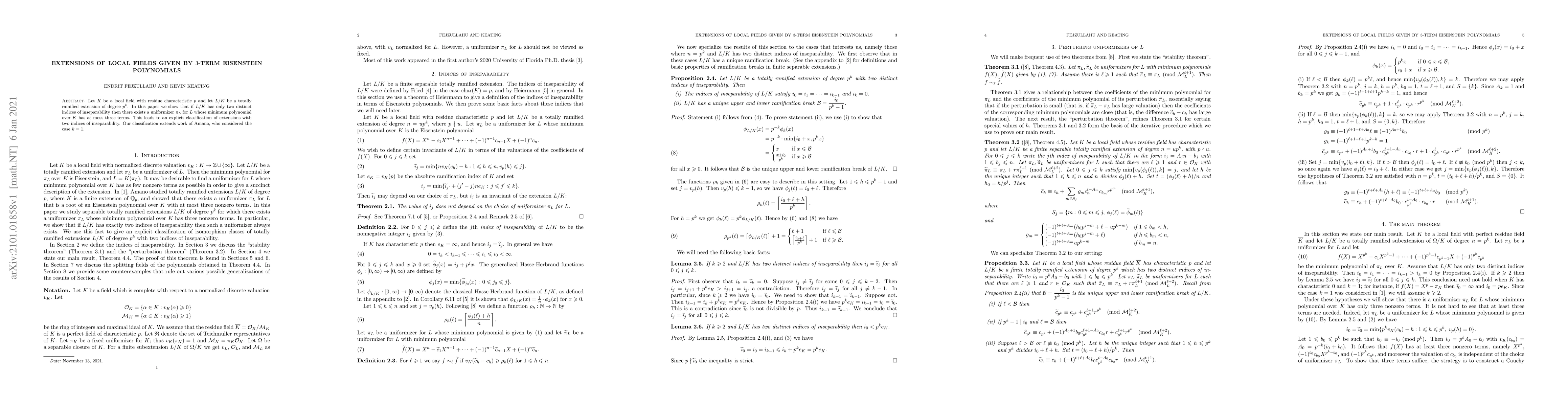 Let $K$ be a local field with residue characteristic $p$ and let $L/K$ be a totally ramified extension of degree $p^k$. In this paper we show that if $L/K$ has only two distinct indices of inseparability then there exists a uniformizer $\pi_L$ for $L$ whose minimum polynomial over $K$ has at most three terms. This leads to an explicit classification of extensions with two indices of inseparability. Our classification extends work of Amano, who considered the case $k=1$.