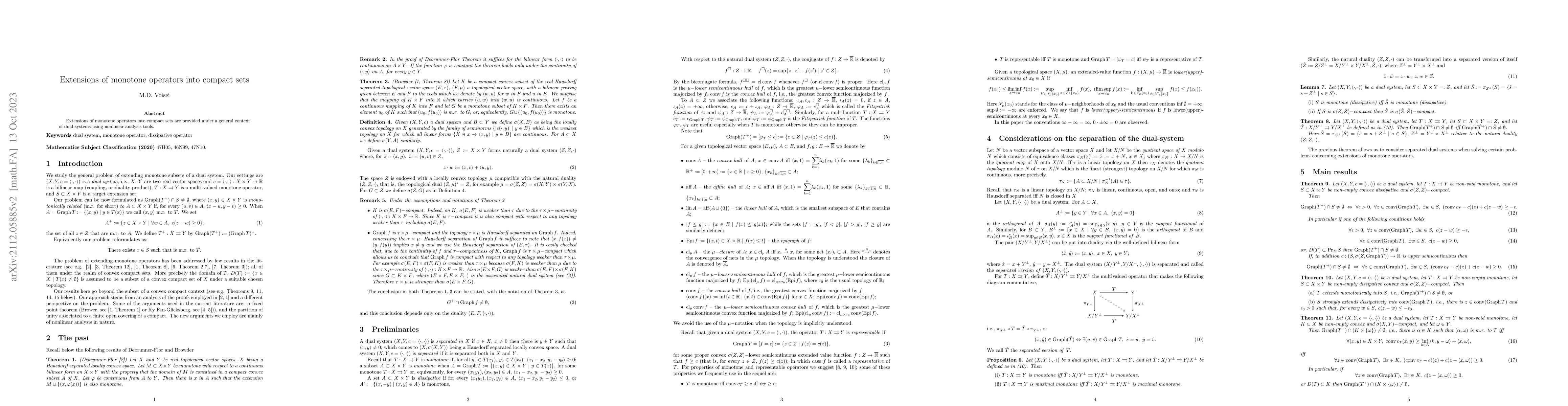 Summary: The paper presents extensions of monotone operators into compact sets within dual systems, utilizing nonlinear analysis techniques to achieve these extensions. The methodology provides a robust framework for handling such extensions in a general context.
