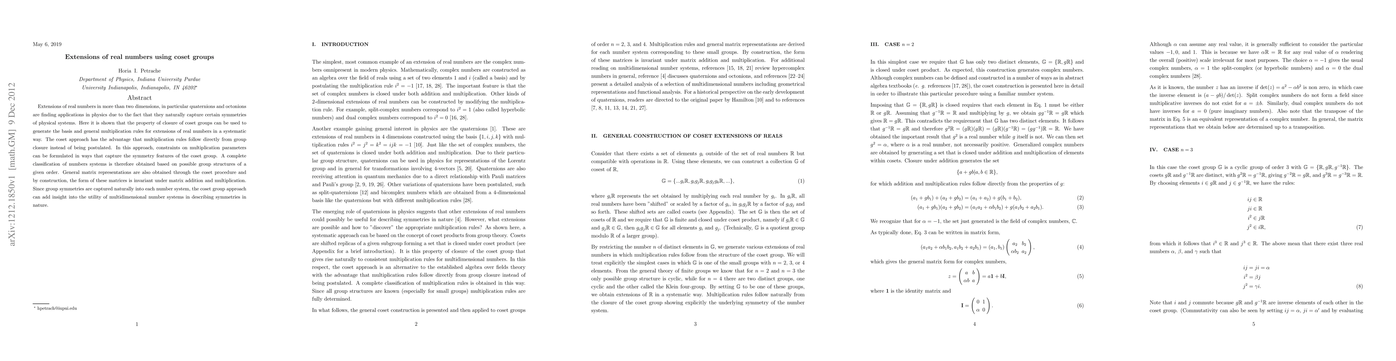 Extensions of real numbers in more than two dimensions, in particular quaternions and octonions are finding applications in physics due to the fact that they naturally capture certain symmetries of physical systems. Here it is shown that the property of closure of coset groups can be used to generate the basis and general multiplication rules for extensions of real numbers in a systematic way. The coset approach has the advantage that multiplication rules follow directly from group closure instead of being postulated. In this approach, constraints on multiplication parameters can be formulated in ways that capture the symmetry features of the coset group. A complete classification of numbers systems is therefore obtained based on possible group structures of a given order. General matrix representations are also obtained through the coset procedure and by construction, the form of these matrices is invariant under matrix addition and multiplication. Since group symmetries are captured naturally into each number system, the coset group approach can add insight into the utility of multidimensional number systems in describing symmetries in nature.
