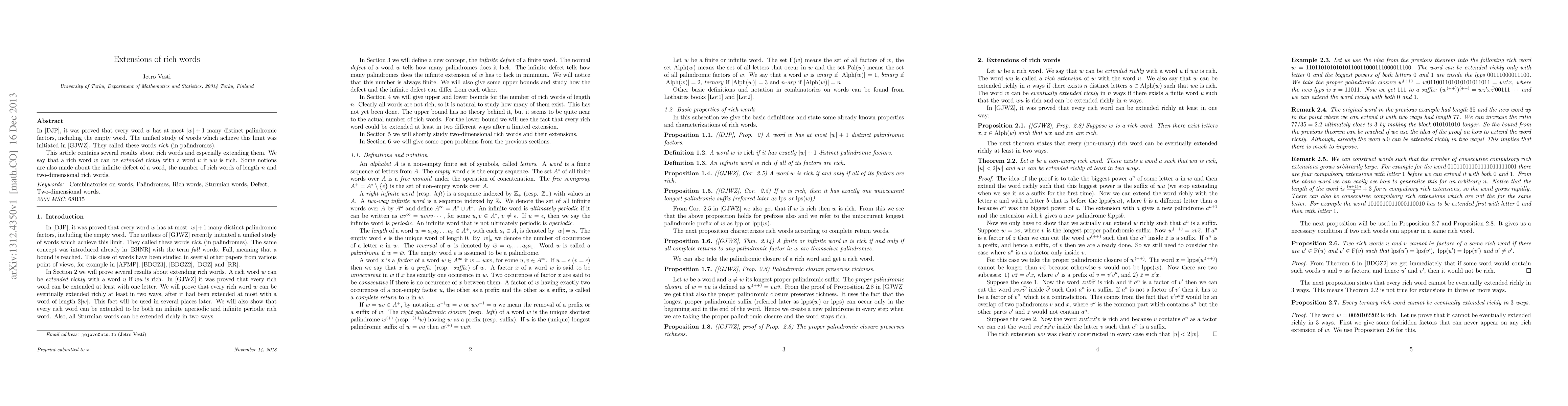 This paper explores the concept of rich words, which are words with the maximum number of distinct palindromic factors, and investigates methods for extending these rich words while maintaining their richness. It also introduces new notions such as the infinite defect of a word and studies the frequency of rich words of various lengths.
