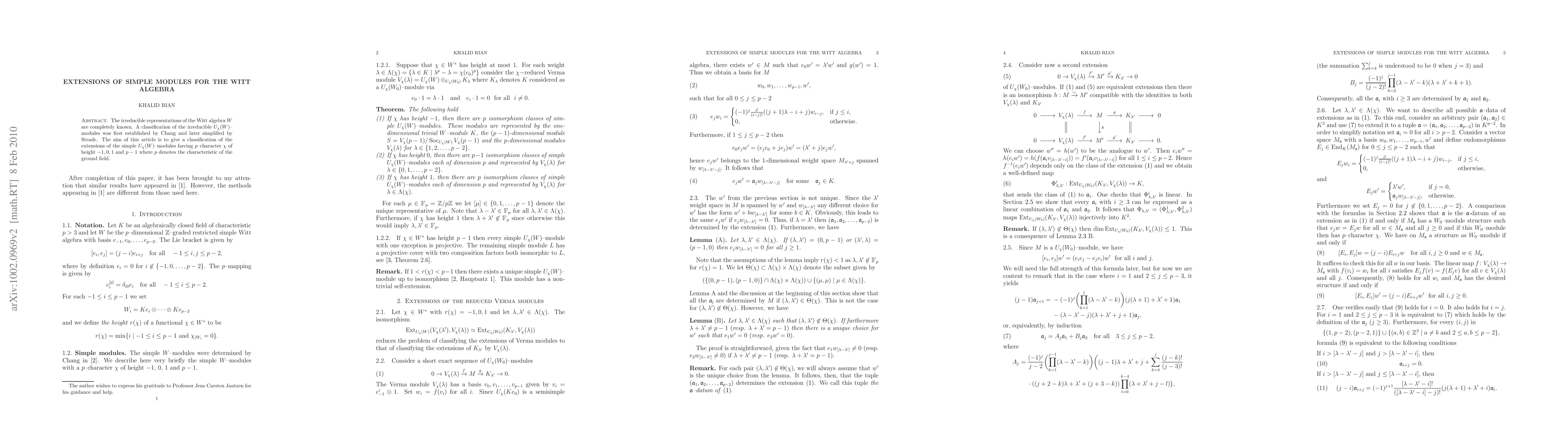 This paper classifies extensions of simple $U_\chi(W)$-modules for the Witt algebra $W$ with $p$-character $\chi$ of heights $-1, 0, 1,$ and $p-1$, building on previous work by Chang and Strade. The focus is on understanding the structure of these extensions in the context of the algebra's irreducible representations.