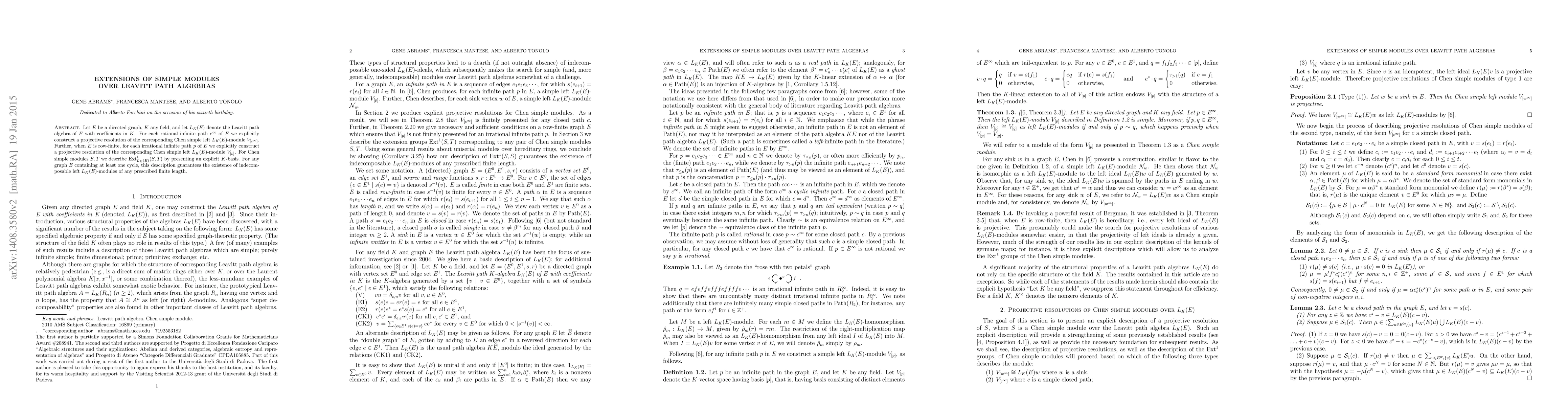 Let $E$ be a directed graph, $K$ any field, and let $L_K(E)$ denote the Leavitt path algebra of $E$ with coefficients in $K$. For each rational infinite path $c^\infty$ of $E$ we explicitly construct a projective resolution of the corresponding Chen simple left $L_K(E)$-module $V_{[c^\infty]}$. Further, when $E$ is row-finite, for each irrational infinite path $p$ of $E$ we explicitly construct a projective resolution of the corresponding Chen simple left $L_K(E)$-module $V_{[p]}$. For Chen simple modules $S,T$ we describe ${\rm Ext}_{L_K(E)}^1(S,T)$ by presenting an explicit $K$-basis. For any graph $E$ containing at least one cycle, this description guarantees the existence of indecomposable left $L_K(E)$-modules of any prescribed finite length.