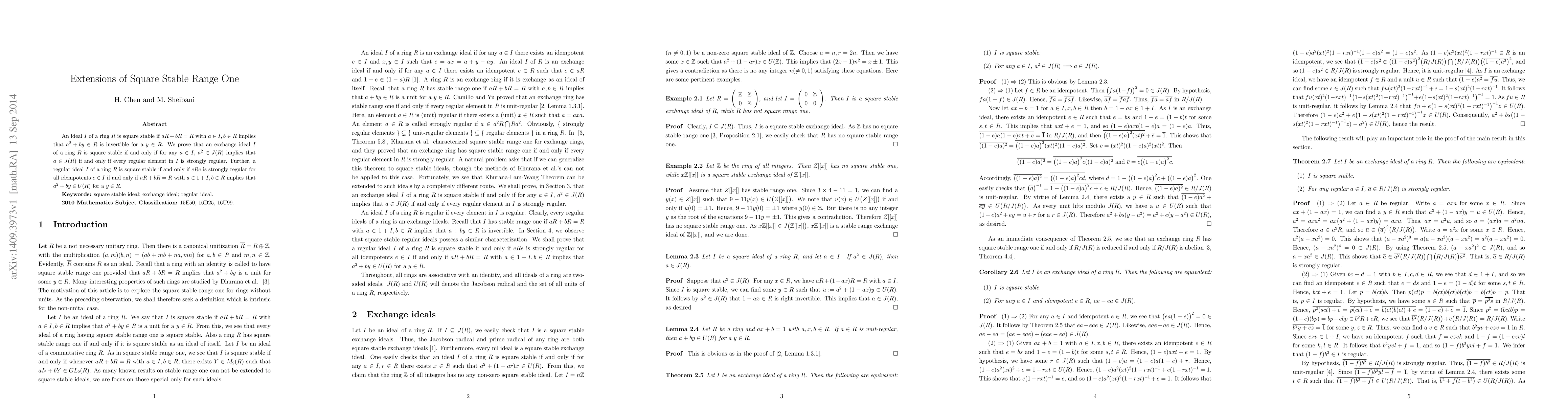An ideal $I$ of a ring $R$ is square stable if $aR+bR=R$ with $a\in I$ and $b\in R$ implies that $a^2+by$ is invertible in $I$ for some $y\in I$. We prove that an exchange ideal $I$ of a ring $R$ is square stable if and only if for any $a\in I$, $a^2\ in J(R)$ implies that $a\in J(R)$, if and only if every regular element in $I$ is strongly regular.