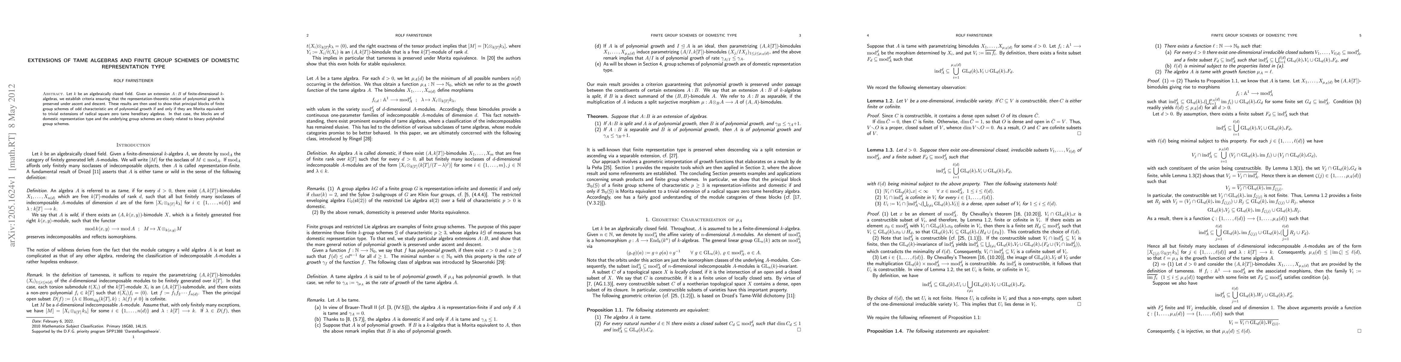 Let k be an algebraically closed field. Given an extension A : B of finite-dimensional k- algebras, we establish criteria ensuring that the representation-theoretic notion of polynomial growth is preserved under ascent and descent. These results are then used to show that principal blocks of finite group schemes of odd characteristic are of polynomial growth if and only if they are Morita equivalent to trivial extensions of radical square zero tame hereditary algebras. In that case, the blocks are of domestic representation type and the underlying group schemes are closely related to binary polyhedral group schemes.