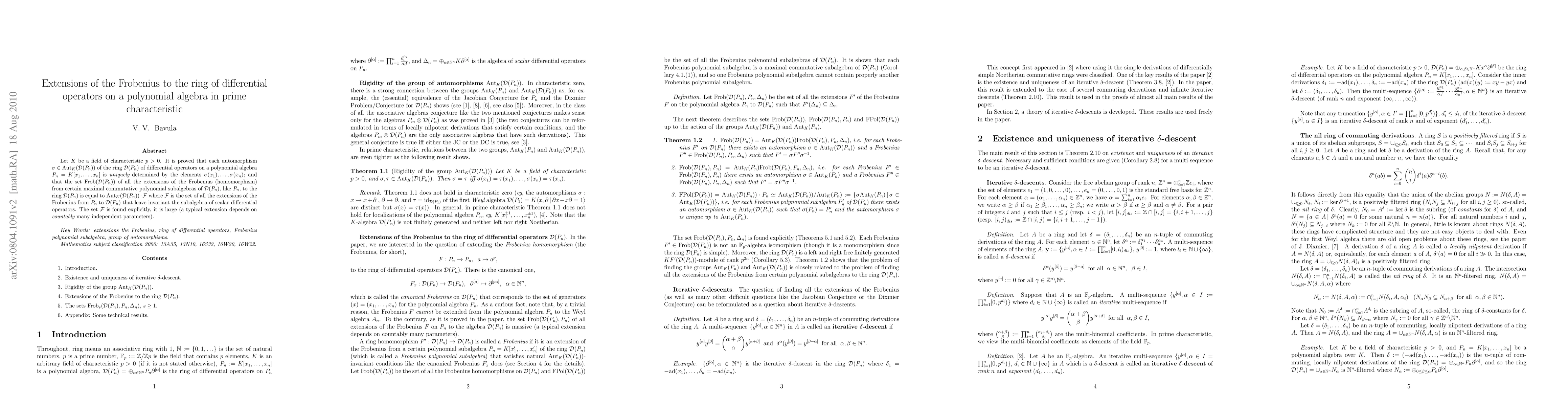 This paper proves that automorphisms of the ring of differential operators on a polynomial algebra in prime characteristic are uniquely determined by their action on the polynomial variables. It also shows that the set of Frobenius extensions from polynomial subalgebras equals the product of the automorphism group and a large set of Frobenius extensions that preserve scalar differential operators.