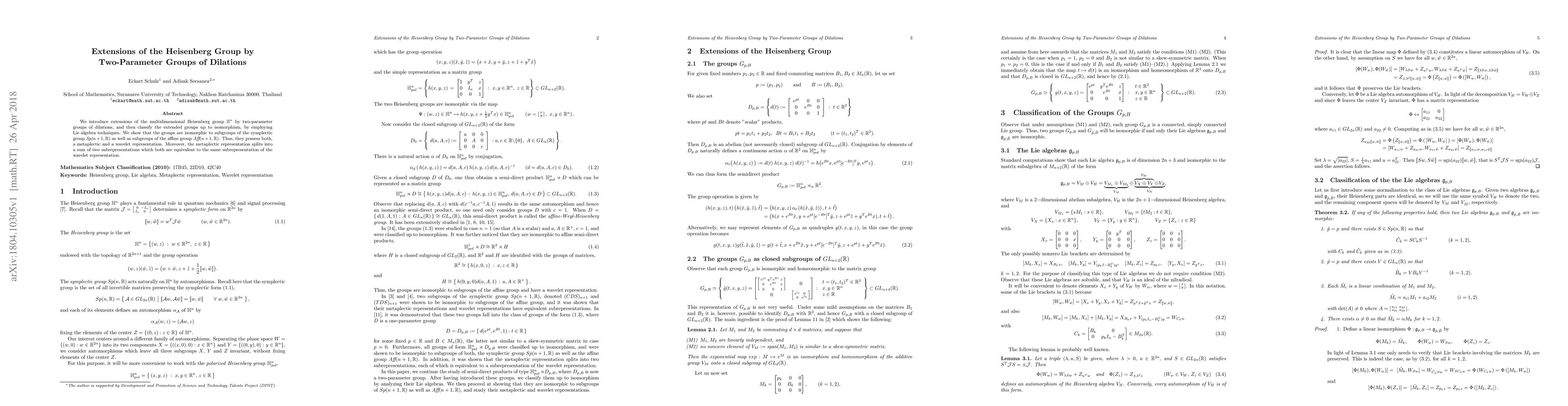 This research paper introduces extensions of the Heisenberg group with two-parameter groups of dilations, classifying them as subgroups of symplectic and affine groups, and revealing a connection between metaplectic and wavelet representations.