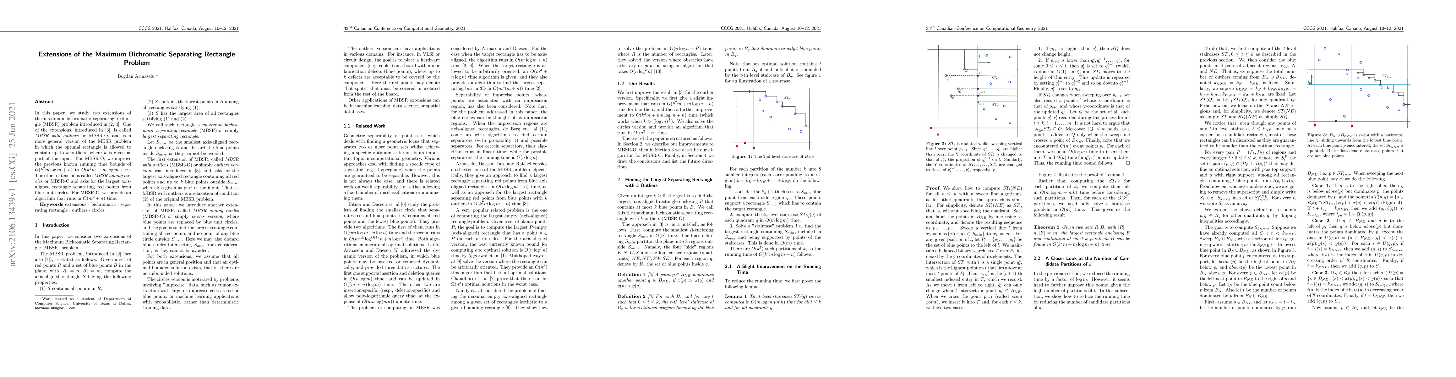 In this paper, we study two extensions of the maximum bichromatic separating rectangle (MBSR) problem introduced in \cite{Armaselu-CCCG, Armaselu-arXiv}. One of the extensions, introduced in \cite{Armaselu-FWCG}, is called \textit{MBSR with outliers} or MBSR-O, and is a more general version of the MBSR problem in which the optimal rectangle is allowed to contain up to $k$ outliers, where $k$ is given as part of the input. For MBSR-O, we improve the previous known running time bounds of $O(k^7 m \log m + n)$ to $O(k^3 m + m \log m + n)$. The other extension is called \textit{MBSR among circles} or MBSR-C and asks for the largest axis-aligned rectangle separating red points from blue unit circles. For MBSR-C, we provide an algorithm that runs in $O(m^2 + n)$ time.