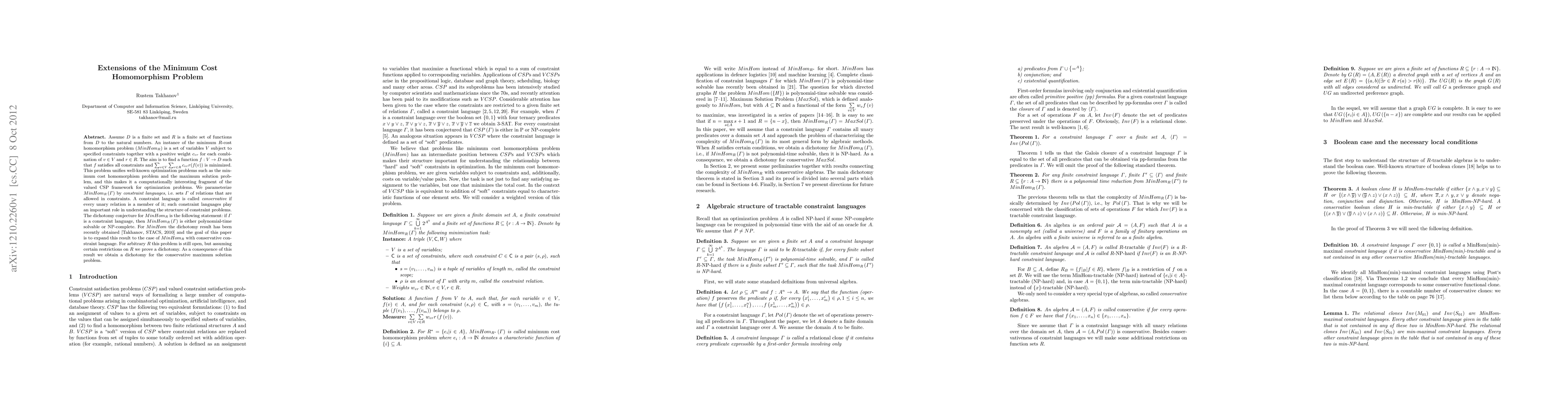 This paper explores the minimum $R$-cost homomorphism problem, unifying several known optimization problems within the valued CSP framework. It aims to extend the known dichotomy result for the minimum cost homomorphism problem to the case with conservative constraint languages, proving a dichotomy under certain restrictions on $R$. This leads to a similar result for the conservative maximum solution problem.