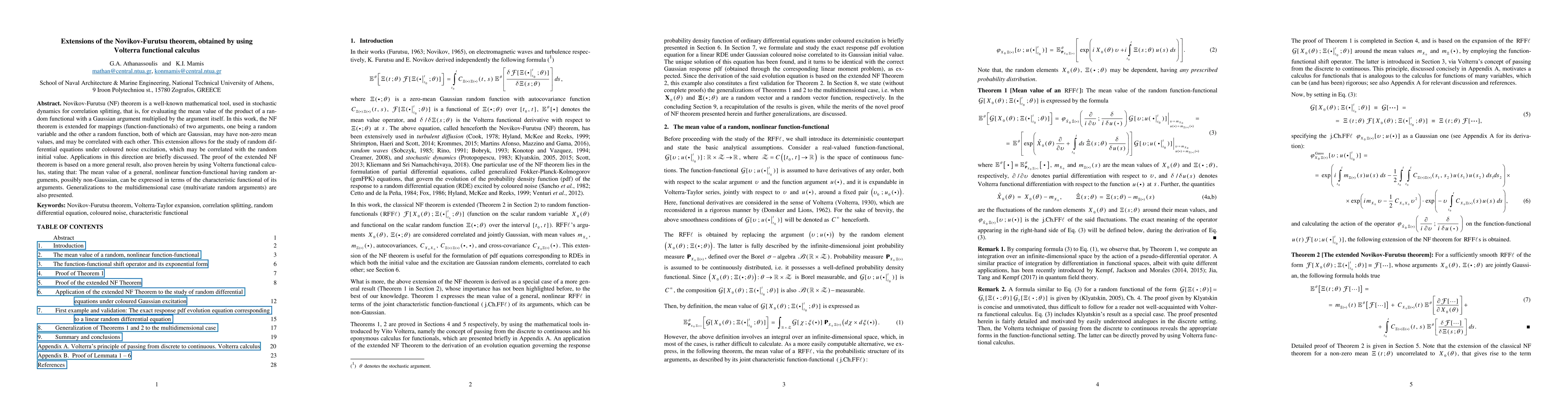 Novikov-Furutsu (NF) theorem is a well-known mathematical tool, used in stochastic dynamics for correlation splitting, that is, for evaluating the mean value of the product of a random functional with a Gaussian argument multiplied by the argument itself. In this work, the NF theorem is extended for mappings (function-functionals) of two arguments, one being a random variable and the other a random function, both of which are Gaussian, may have non-zero mean values, and may be correlated with each other. This extension allows for the study of random differential equations under coloured noise excitation, which may be correlated with the random initial value. Applications in this direction are briefly discussed. The proof of the extended NF theorem is based on a more general result, also proven herein by using Volterra functional calculus, stating that: The mean value of a general, nonlinear function-functional having random arguments, possibly non-Gaussian, can be expressed in terms of the characteristic functional of its arguments. Generalizations to the multidimensional case (multivariate random arguments) are also presented.