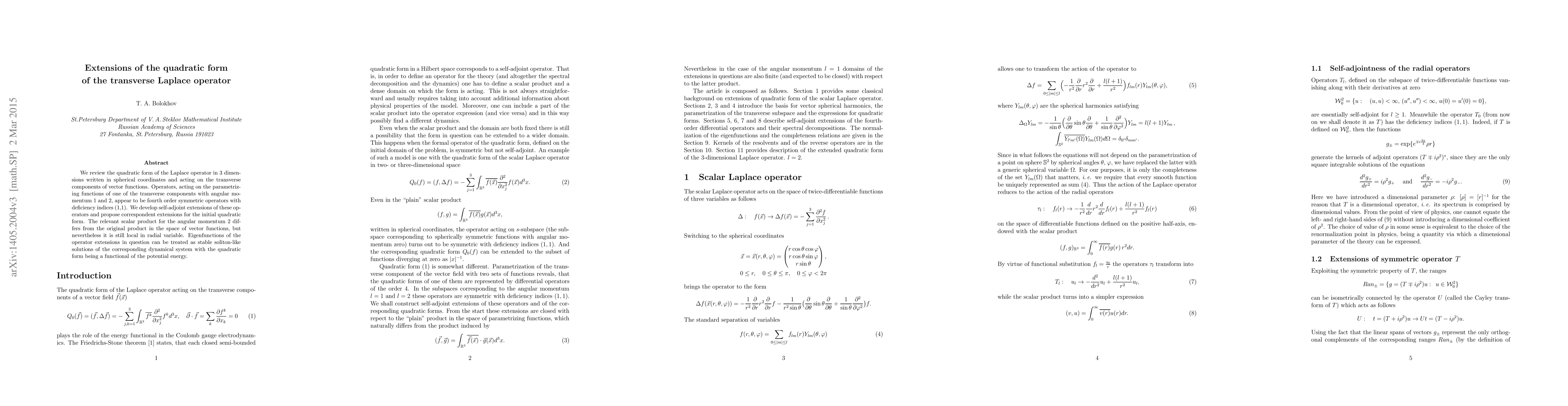 We review the quadratic form of the Laplace operator in 3 dimensions in spehrical coordinates which acts on the transverse components of vector functions. Operators, acting on the parametrizing functions of one of the transverse components with angular momentum 1 and 2, appear to be fourth order symmetric differential operators with deficiency indices (1,1). We develop self-adjoint extensions of these operators and propose correspondent extensions for the initial quadratic form. The relevant scalar product for the angular momentum 2 differs from the original product in the space of vector functions, but nevertheless it is still local in radial variable.