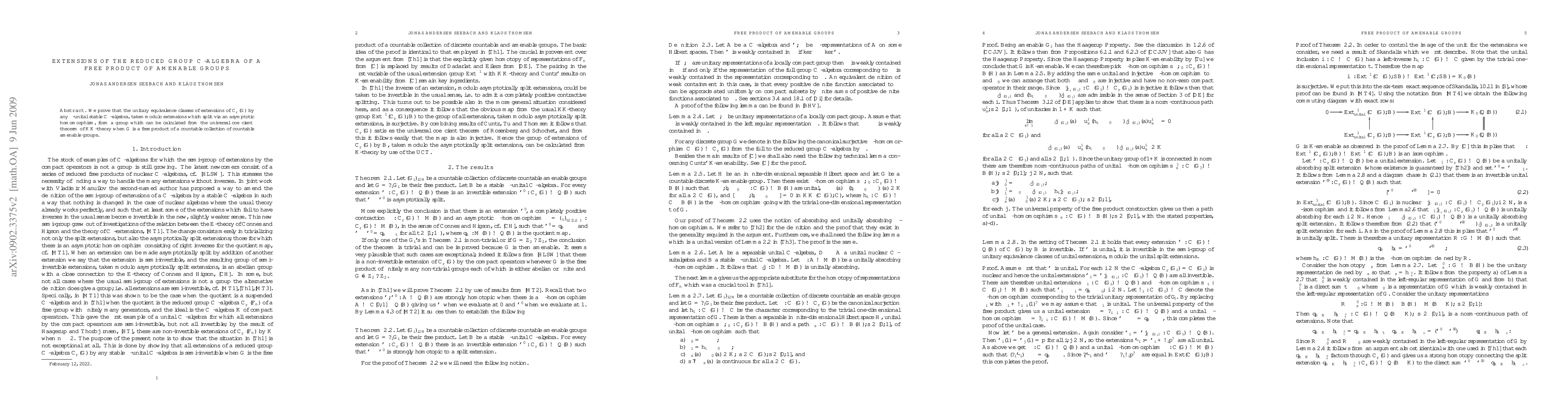 This research proves that certain extensions of the reduced C*-algebra of a free product of amenable groups form a group, calculable via the universal coefficient theorem of KK-theory. The study focuses on sigma-unital stable C*-algebras, excluding those that split through asymptotic homomorphisms.