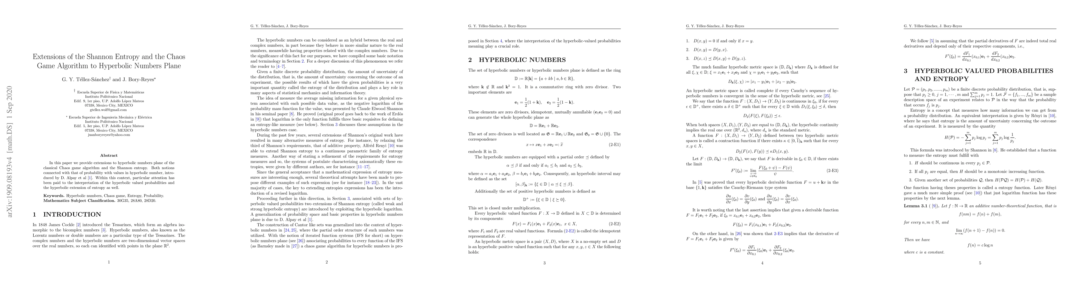 This paper extends the Chaos game algorithm and Shannon entropy to the hyperbolic numbers plane, incorporating hyperbolic valued probabilities introduced by D. Alpay et al. Special focus is given to interpreting these hyperbolic probabilities and the corresponding entropy extension.