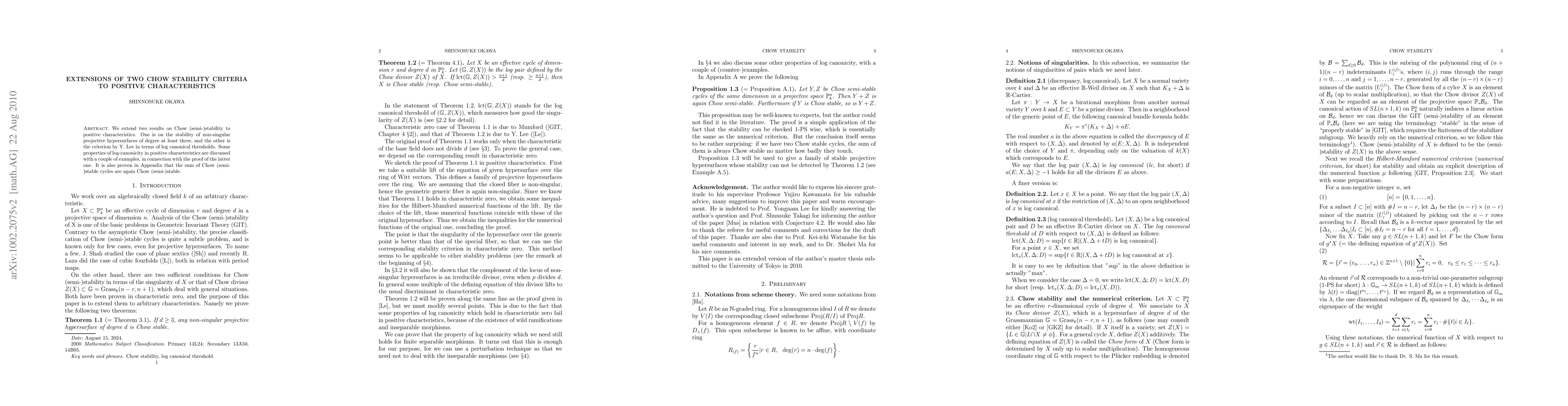 We extend two results on Chow (semi-)stability to positive characteristics. One is on the stability of non-singular projective hypersurfaces of degree greater than 2, and the other is the criterion by Y. Lee in terms of log canonical thresholds. Some properties of log-canonicity in positive characteristics are discussed with a couple of examples, in connection with the proof of the latter one. It is also proven in appendix that the sum of Chow (semi-)stable cycles are again Chow (semi-)stable.