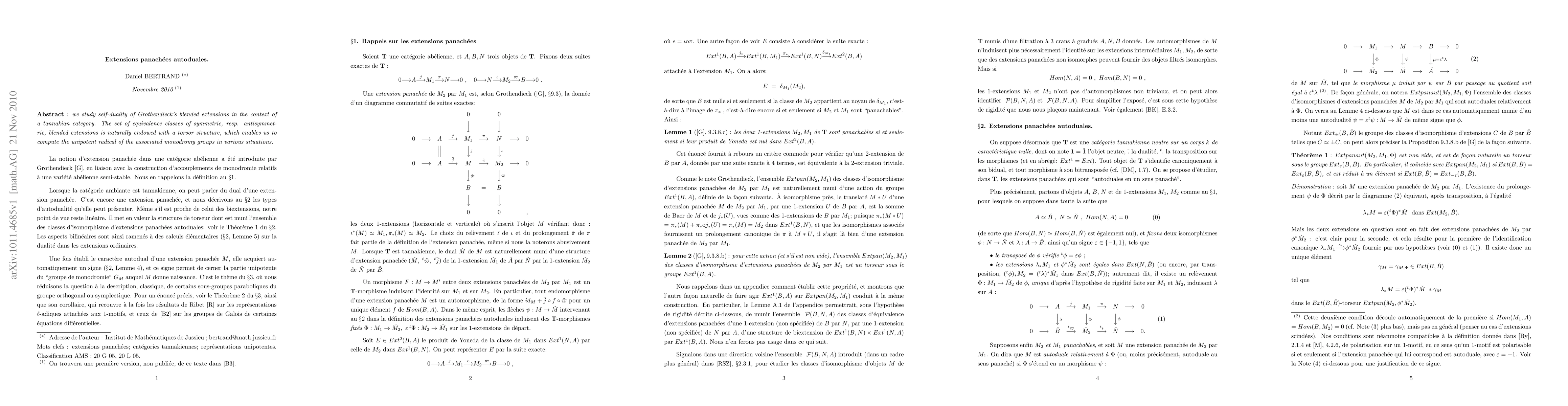 This paper explores the self-duality of Grothendieck's blended extensions (extensions panachées) within tannakian categories, revealing a torsor structure for symmetric and antisymmetric extensions, and calculating the unipotent radical of associated monodromy groups.