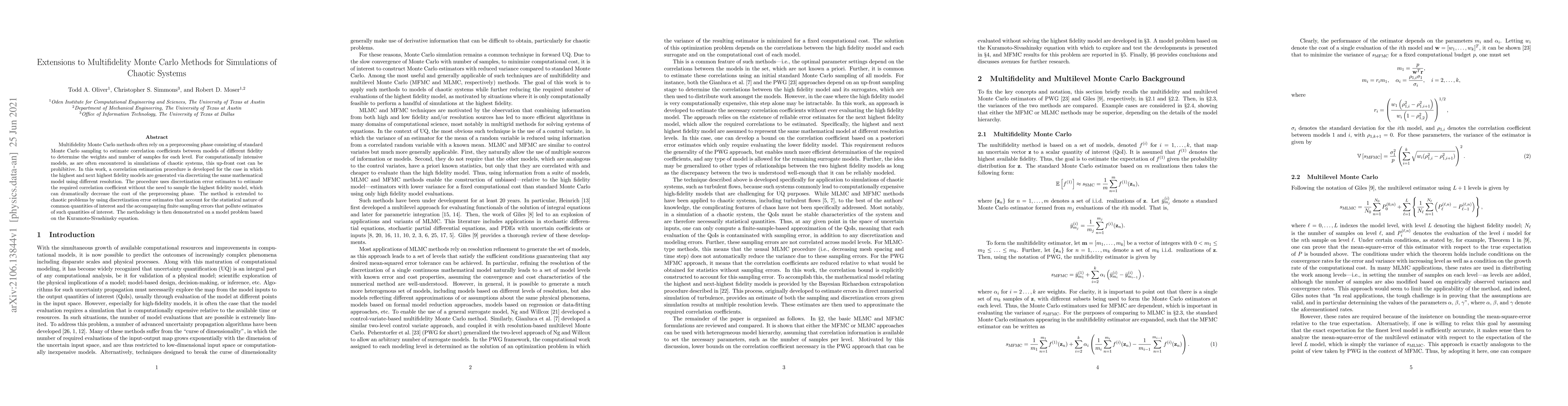 Multifidelity Monte Carlo methods often rely on a preprocessing phase consisting of standard Monte Carlo sampling to estimate correlation coefficients between models of different fidelity to determine the weights and number of samples for each level. For computationally intensive models, as are often encountered in simulations of chaotic systems, this up-front cost can be prohibitive. In this work, a correlation estimation procedure is developed for the case in which the highest and next highest fidelity models are generated via discretizing the same mathematical model using different resolution. The procedure uses discretization error estimates to estimate the required correlation coefficient without the need to sample the highest fidelity model, which can dramatically decrease the cost of the preprocessing phase. The method is extended to chaotic problems by using discretization error estimates that account for the statistical nature of common quantities of interest and the accompanying finite sampling errors that pollute estimates of such quantities of interest. The methodology is then demonstrated on a model problem based on the Kuramoto-Sivashinsky equation.