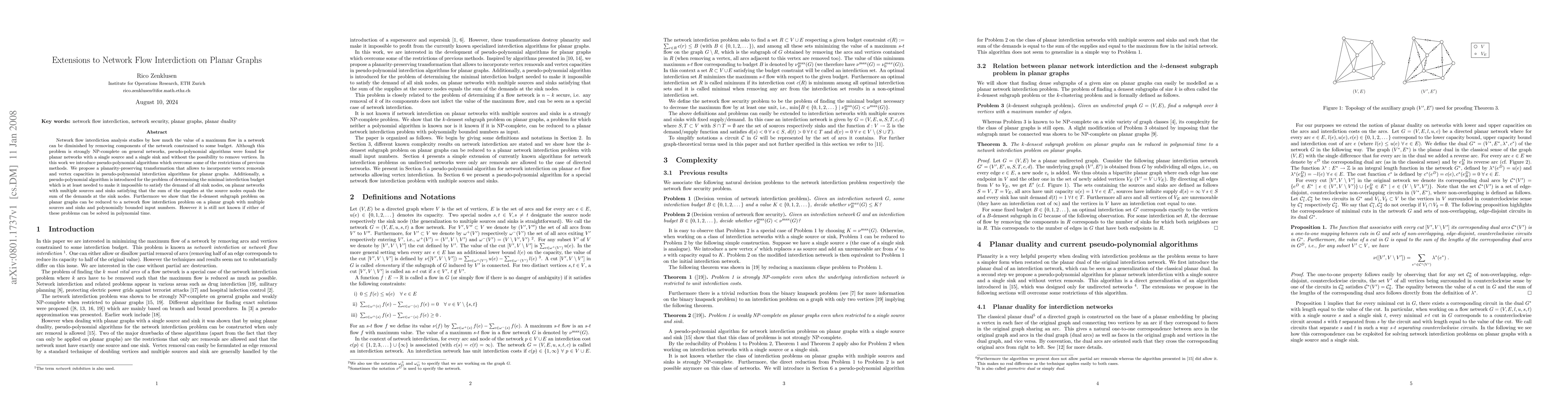 This paper extends pseudo-polynomial algorithms for network flow interdiction on planar graphs, allowing vertex removals and capacities, and introduces a method to make it impossible to satisfy sink demands with minimal budget. It also connects the k-densest subgraph problem to network flow interdiction but notes the lack of polynomial-time solutions for these problems.