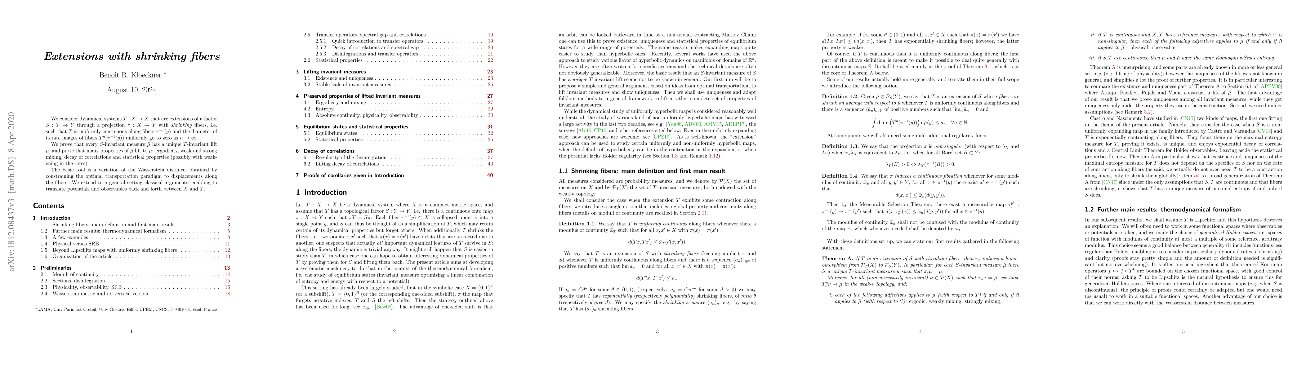 We consider dynamical systems $T: X \to X$ that are extensions of a factor $S: Y \to Y$ through a projection $\pi: X \to Y$ with shrinking fibers, i.e. such that $T$ is uniformly continuous along fibers $\pi^{-1}(y)$ and the diameter of iterate images of fibers $T^n(\pi^{-1}(y))$ uniformly go to zero as $n \to \infty$.We prove that every $S$-invariant measure has a unique $T$-invariant lift, and prove that many properties of the original measure lift: ergodicity, weak and strong mixing, decay of correlations and statistical properties (possibly with weakening in the rates).The basic tool is a variation of the Wasserstein distance, obtained by constraining the optimal transportation paradigm to displacements along the fibers. We extend to a general setting classical arguments, enabling to translate potentials and observables back and forth between $X$ and $Y$.