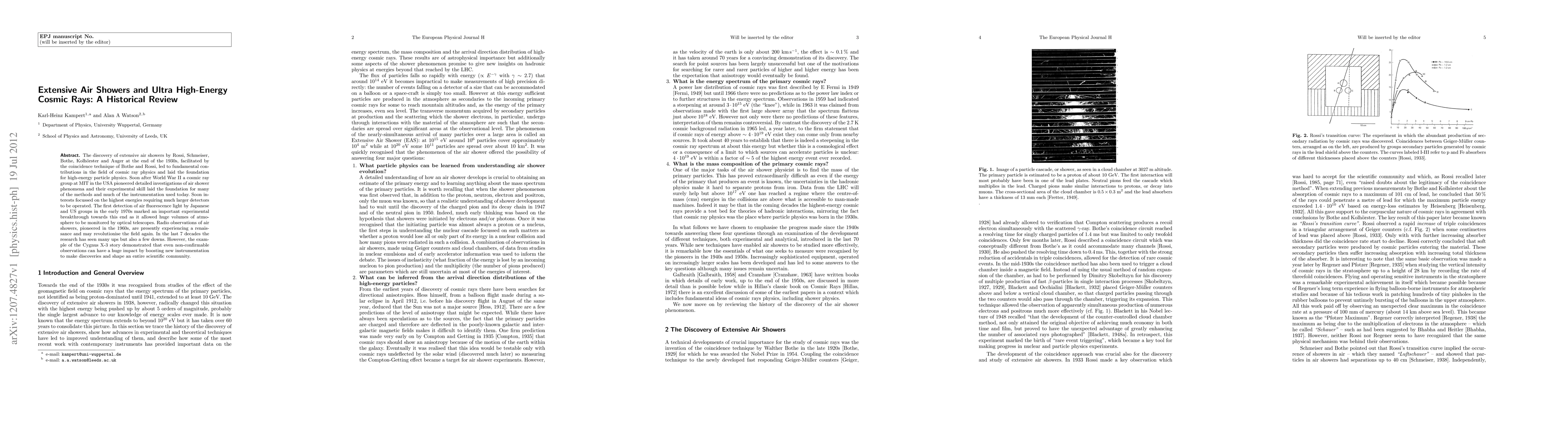 The paper provides a historical review of extensive air shower (EAS) research, starting from the discovery by Rossi, Schmeiser, Bothe, Kolh"orster, and Auger, and the subsequent advancements by MIT, Japanese, and US groups. It highlights the development of techniques like fluorescence light monitoring and radio observations.