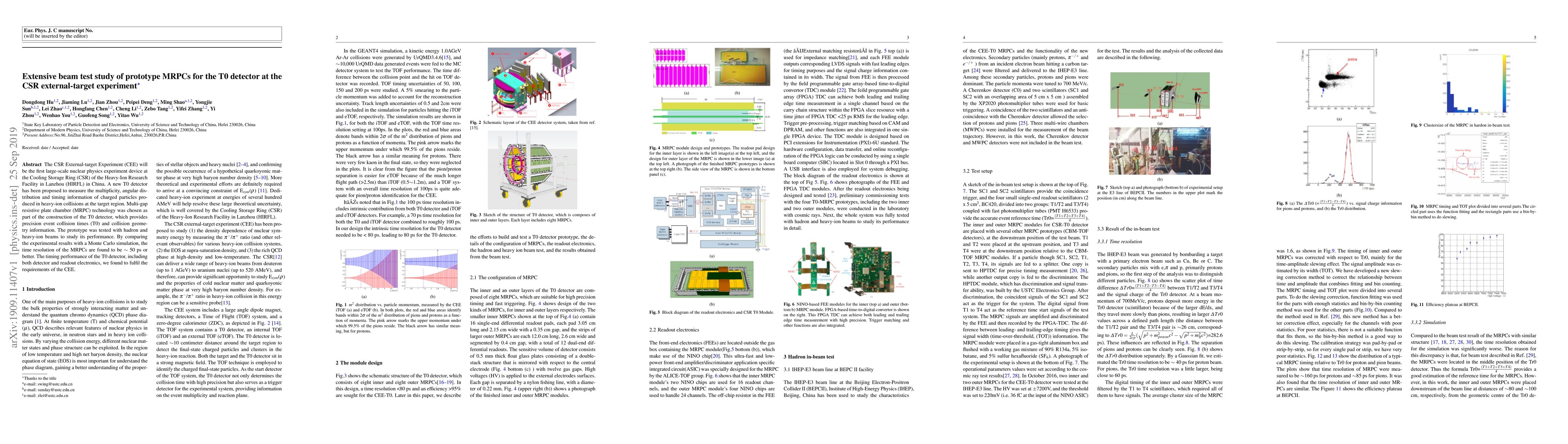 The CSR External-target Experiment (CEE) will be the first large-scale nuclear physics experiment device at the Cooling Storage Ring (CSR) of the Heavy-Ion Research Facility in Lanzhou (HIRFL) in China. A new T0 detector has been proposed to measure the multiplicity, angular distribution and timing information of charged particles produced in heavy-ion collisions at the target region. Multi-gap resistive plate chamber (MRPC) technology was chosen as part of the construction of the T0 detector, which provides precision event collision times (T0) and collision geometry information. The prototype was tested with hadron and heavy-ion beams to study its performance. By comparing the experimental results with a Monte Carlo simulation, the time resolution of the MRPCs are found to be $\sim$ 50 ps or better. The timing performance of the T0 detector, including both detector and readout electronics, we found to fulfil the requirements of the CEE.