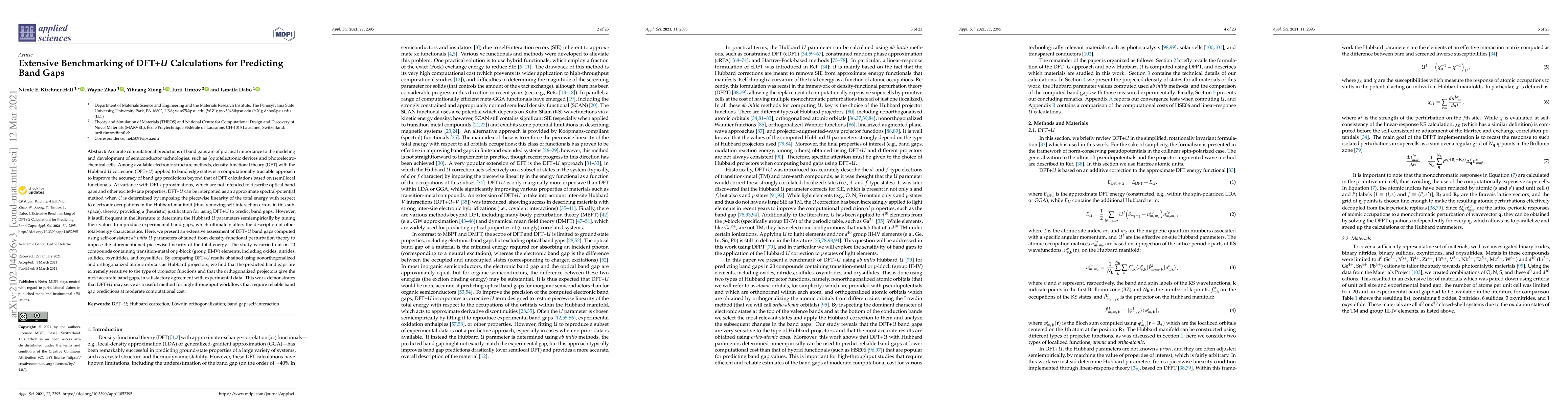 This paper conducts an extensive benchmarking of DFT+U calculations for predicting band gaps in various compounds, using self-consistent ab initio U parameters derived from density-functional perturbation theory. The study aims to improve the accuracy of band gap predictions beyond standard DFT methods, focusing on 20 compounds with transition-metal or p-block elements.
