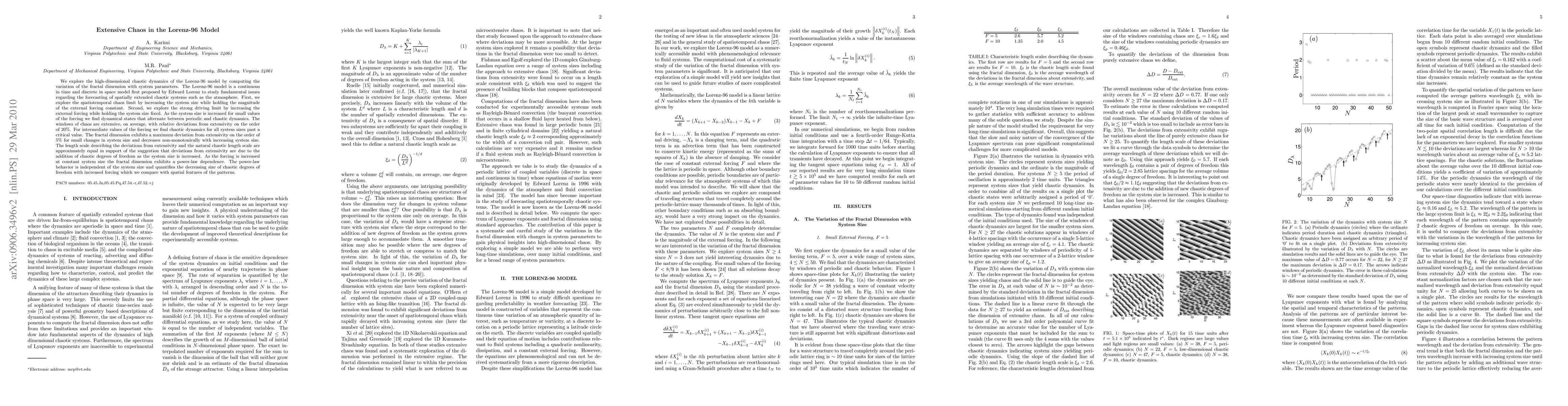This paper investigates the chaotic dynamics in the Lorenz-96 model, finding extensive windows of chaos with periodic-to-chaotic transitions as system size increases for small forcing. The fractal dimension shows non-monotonic behavior with system size, supporting the idea that deviations from extensivity arise from added chaotic degrees of freedom.
