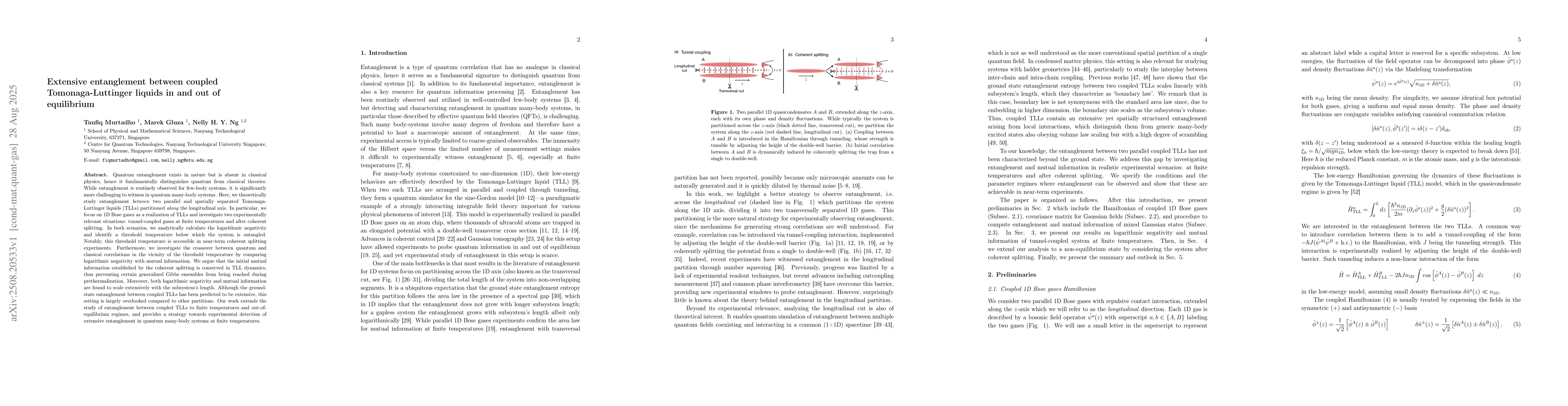 Quantum entanglement exists in nature but is absent in classical physics, hence it fundamentally distinguishes quantum from classical theories. While entanglement is routinely observed for few-body systems, it is significantly more challenging to witness in quantum many-body systems. Here, we theoretically study entanglement between two parallel and spatially separated Tomonaga-Luttinger liquids (TLLs) partitioned along the longitudinal axis. In particular, we focus on 1D Bose gases as a realization of TLLs and investigate two experimentally relevant situations: tunnel-coupled gases at finite temperatures and after coherent splitting. In both scenarios, we analytically calculate the logarithmic negativity and identify a threshold temperature below which the system is entangled. Notably, this threshold temperature is accessible in near-term coherent splitting experiments. Furthermore, we investigate the crossover between quantum and classical correlations in the vicinity of the threshold temperature by comparing logarithmic negativity with mutual information. We argue that the initial mutual information established by the coherent splitting is conserved in TLL dynamics, thus preventing certain generalized Gibbs ensembles from being reached during prethermalization. Moreover, both logarithmic negativity and mutual information are found to scale extensively with the subsystem's length. Although the ground-state entanglement between coupled TLLs has been predicted to be extensive, this setting is largely overlooked compared to other partitions. Our work extends the study of entanglement between coupled TLLs to finite temperatures and out-of-equilibrium regimes, and provides a strategy towards experimental detection of extensive entanglement in quantum many-body systems at finite temperatures.