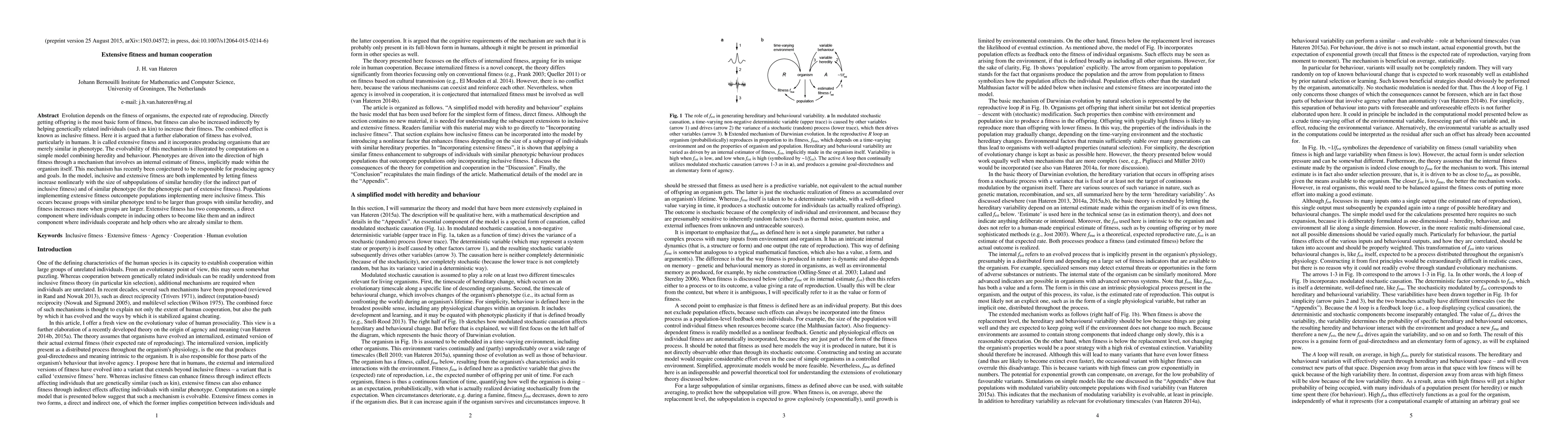 Evolution depends on the fitness of organisms, the expected rate of reproducing. Directly getting offspring is the most basic form of fitness, but fitness can also be increased indirectly by helping genetically related individuals (such as kin) to increase their fitness. The combined effect is known as inclusive fitness. Here it is argued that a further elaboration of fitness has evolved, particularly in humans. It is called extensive fitness and it incorporates producing organisms that are merely similar in phenotype. The evolvability of this mechanism is illustrated by computations on a simple model combining heredity and behaviour. Phenotypes are driven into the direction of high fitness through a mechanism that involves an internal estimate of fitness, implicitly made within the organism itself. This mechanism has recently been conjectured to be responsible for producing agency and goals. In the model, inclusive and extensive fitness are both implemented by letting fitness increase nonlinearly with the size of subpopulations of similar heredity (for the indirect part of inclusive fitness) and of similar phenotype (for the phenotypic part of extensive fitness). Populations implementing extensive fitness outcompete populations implementing mere inclusive fitness. This occurs because groups with similar phenotype tend to be larger than groups with similar heredity, and fitness increases more when groups are larger. Extensive fitness has two components, a direct component where individuals compete in inducing others to become like them and an indirect component where individuals cooperate and help others who are already similar to them.