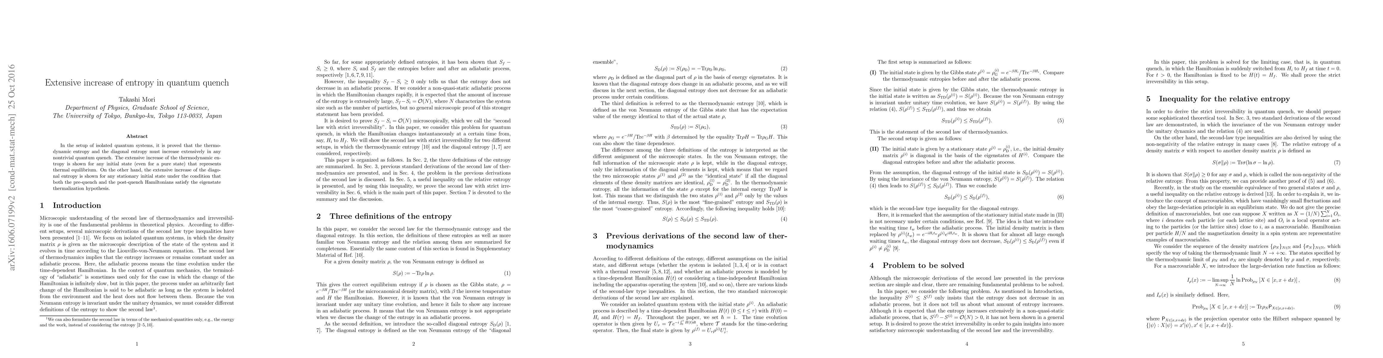This paper demonstrates that in isolated quantum systems undergoing a quantum quench, both thermodynamic entropy and diagonal entropy increase extensively. The thermodynamic entropy increases for any initial thermal equilibrium state, while the diagonal entropy increases for any stationary initial state if both pre- and post-quench Hamiltonians adhere to the eigenstate thermalization hypothesis.