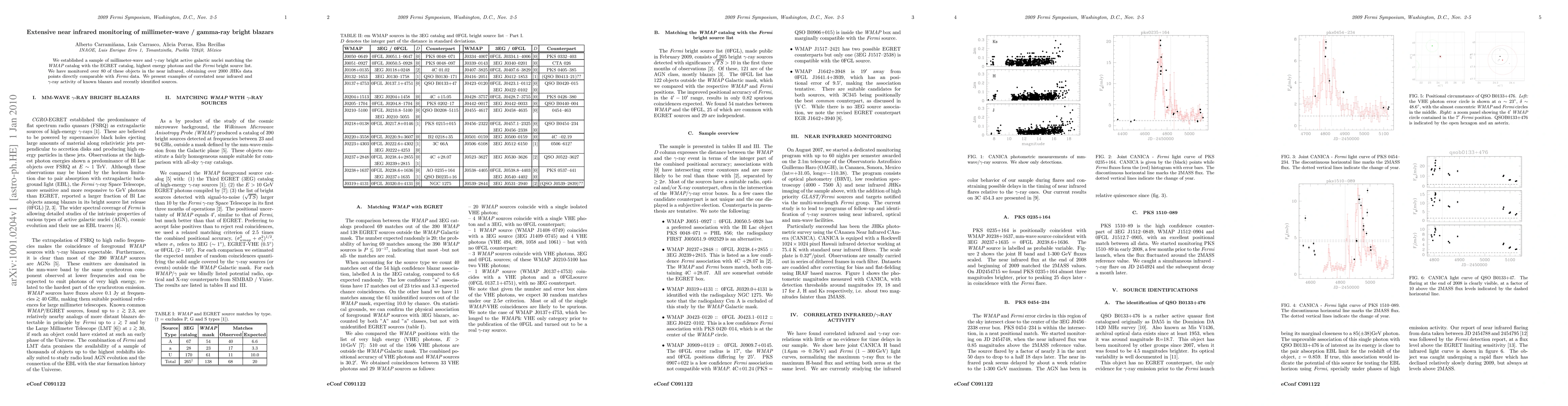 We established a sample of millimeter-wave and gamma-ray bright active galactic nuclei matching the WMAP catalog with the EGRET catalog, highest energy photons and the Fermi bright source list. We have monitored over 80 of these objects in the near infrared, obtaining over 2000 JHKs data points directly comparable with Fermi data. We present examples of correlated near infrared and gamma-ray activity of known blazars and recently identified sources.