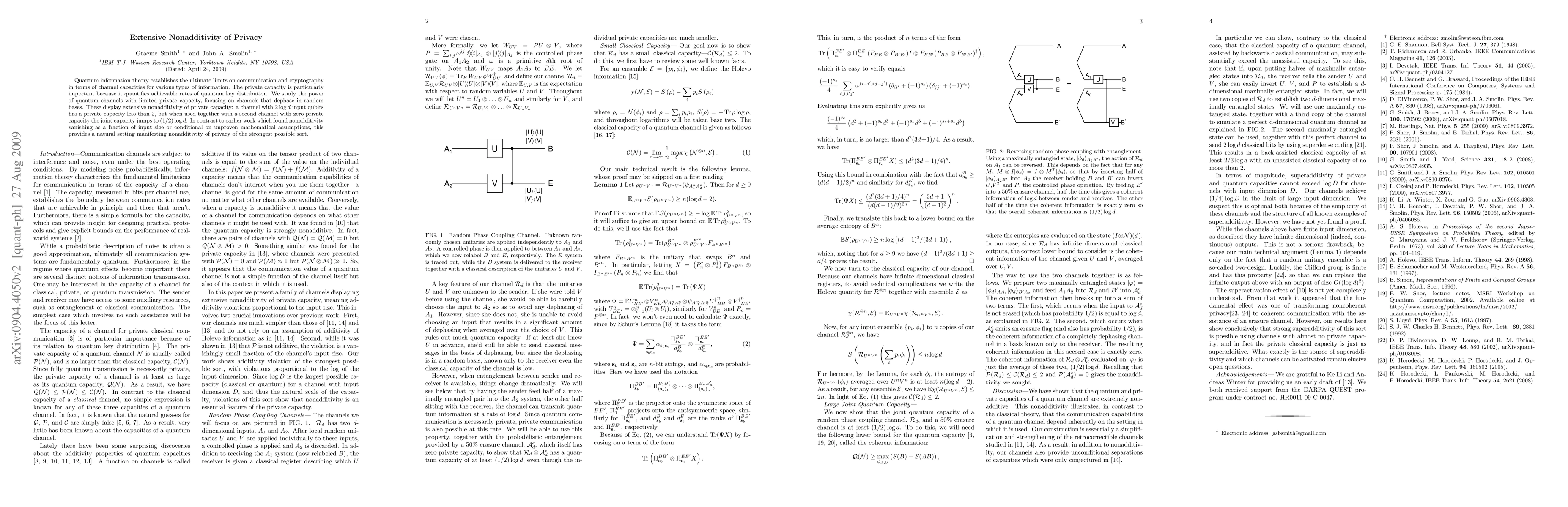 Quantum information theory establishes the ultimate limits on communication and cryptography in terms of channel capacities for various types of information. The private capacity is particularly important because it quantifies achievable rates of quantum key distribution. We study the power of quantum channels with limited private capacity, focusing on channels that dephase in random bases. These display extensive nonadditivity of private capacity: a channel with 2 log d input qubits has a private capacity less than 2, but when used together with a second channel with zero private capacity the joint capacity jumps to (1/2)log d. In contrast to earlier work which found nonadditivity vanishing as a fraction of input size or conditional on unproven mathematical assumptions, this provides a natural setting manifesting nonadditivity of privacy of the strongest possible sort.