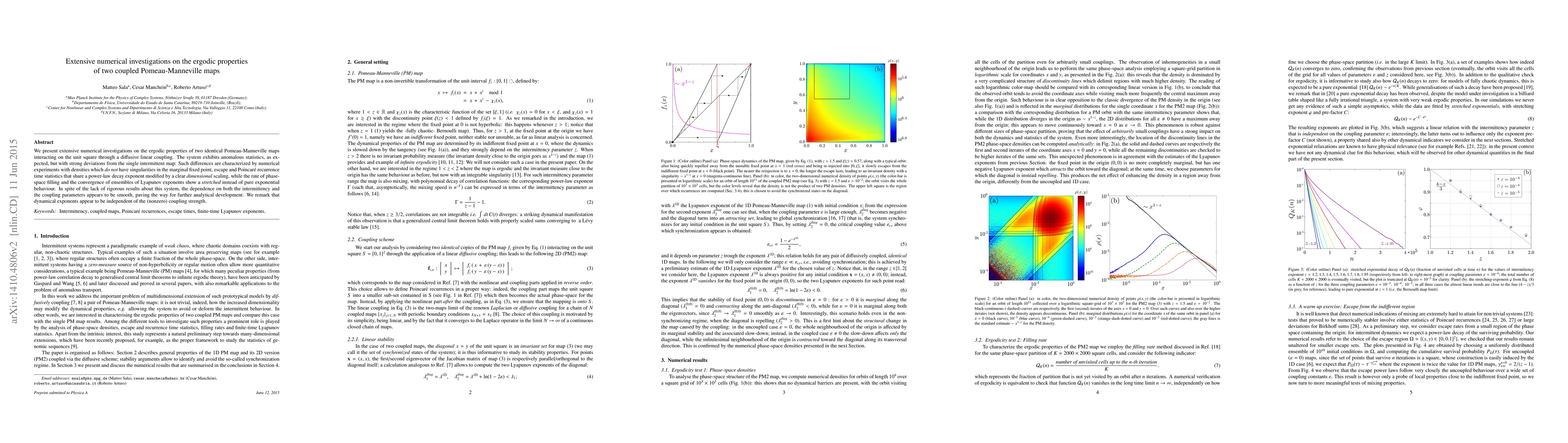 We present extensive numerical investigations on the ergodic properties of two identical Pomeau-Manneville maps interacting on the unit square through a diffusive linear coupling. The system exhibits anomalous statistics, as expected, but with strong deviations from the single intermittent map: Such differences are characterized by numerical experiments with densities which {\it do not} have singularities in the marginal fixed point, escape and Poincar\'e recurrence time statistics that share a power-law decay exponent modified by a clear {\it dimensional} scaling, while the rate of phase-space filling and the convergence of ensembles of Lyapunov exponents show a {\it stretched} instead of pure exponential behaviour. In spite of the lack of rigorous results about this system, the dependence on both the intermittency and the coupling parameters appears to be smooth, paving the way for further analytical development. We remark that dynamical exponents appear to be independent of the (nonzero) coupling strength.