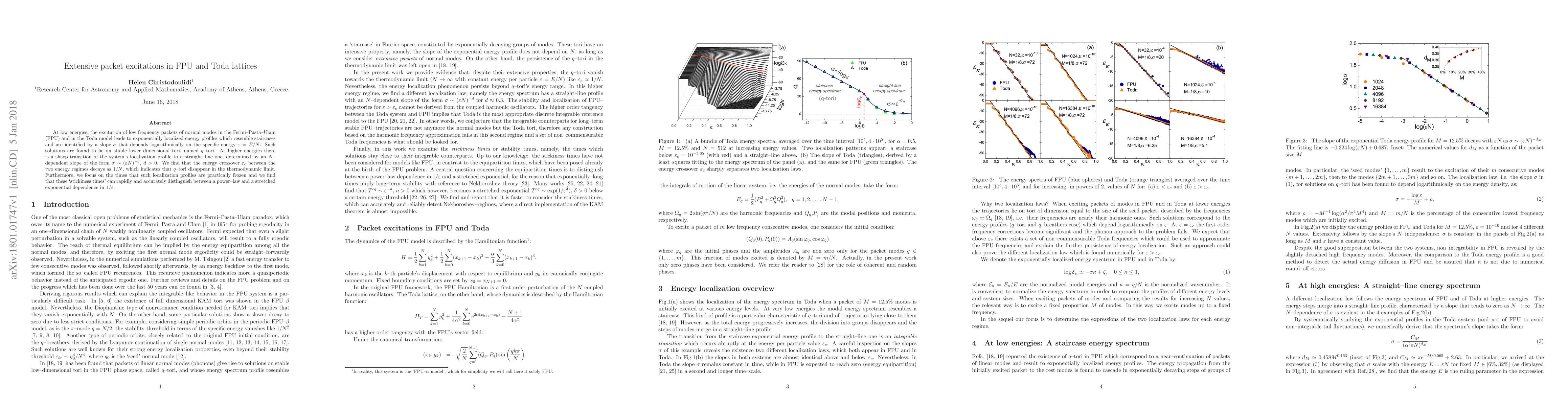 At low energies, the excitation of low frequency packets of normal modes in the Fermi-Pasta-Ulam (FPU) and in the Toda model leads to exponentially localized energy profiles which resemble staircases and are identified by a slope $\sigma$ that depends logarithmically on the specific energy $\varepsilon=E/N$. Such solutions are found to lie on stable lower dimensional tori, named $q$-tori. At higher energies there is a sharp transition of the system's localization profile to a straight-line one, determined by an $N$-dependent slope of the form $\sigma \sim (\varepsilon N)^{-d}$, $d>0$. We find that the energy crossover $\varepsilon_c$ between the two energy regimes decays as $1/N$, which indicates that $q$-tori disappear in the thermodynamic limit. Furthermore, we focus on the times that such localization profiles are practically frozen and we find that these "stickiness times" can rapidly and accurately distinguish between a power-law and a stretched exponential dependence in $1/\varepsilon $.