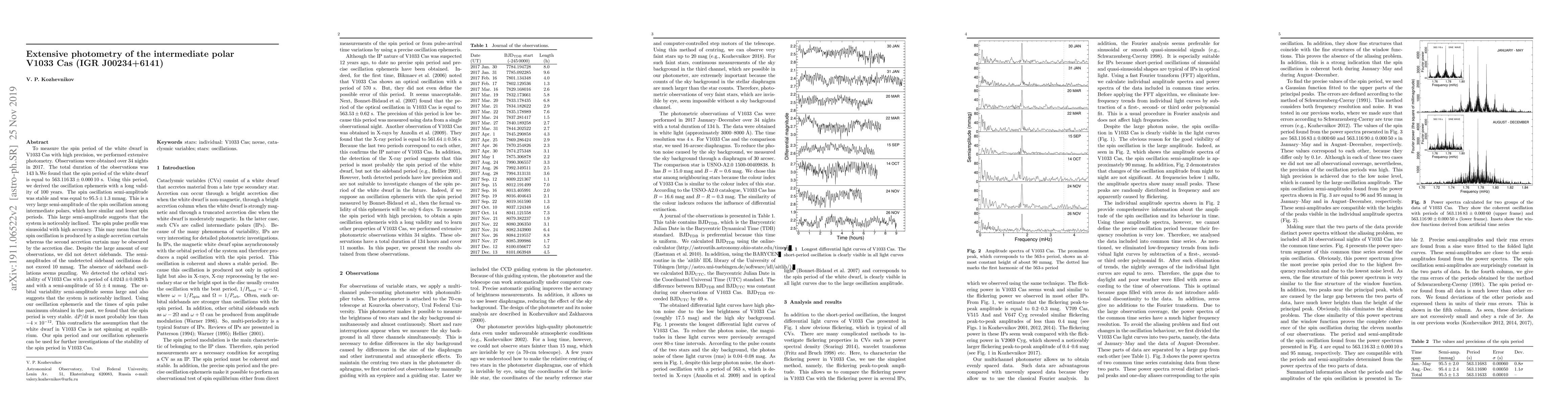 Astronomers measured the spin period of white dwarf V1033 Cas with high precision, finding a large semi-amplitude suggesting a noticeably inclined system. The study used extensive photometry over 34 nights to create an oscillation ephemeris valid for 100 years.