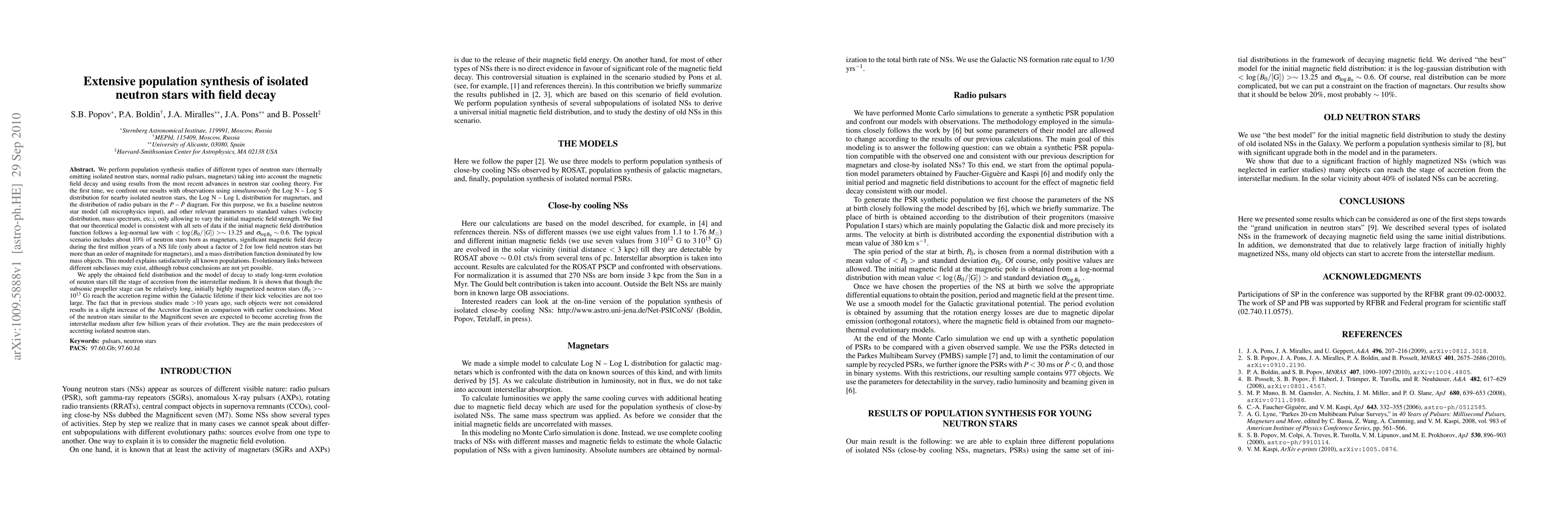 We perform population synthesis studies of different types of neutron stars taking into account the magnetic field decay. For the first time, we confront our results with observations using {\it simultaneously} the Log N -- Log S distribution for nearby isolated neutron stars, the Log N -- Log L distribution for magnetars, and the distribution of radio pulsars in the $P$ -- $\dot P$ diagram. We find that our theoretical model is consistent with all sets of data if the initial magnetic field distribution function follows a log-normal law with $<\log (B_0/[G]) > \sim 13.25$ and $\sigma_{\log B_0}\sim 0.6$. The typical scenario includes about 10% of neutron stars born as magnetars, significant magnetic field decay during the first million years of a NS life. Evolutionary links between different subclasses may exist, although robust conclusions are not yet possible. We apply the obtained field distribution and the model of decay to study long-term evolution of neuton stars till the stage of accretion from the interstellar medium. It is shown that though the subsonic propeller stage can be relatively long, initially highly magnetized neutron stars ($B_0 > \sim 10^{13}$ G) reach the accretion regime within the Galactic lifetime if their kick velocities are not too large. The fact that in previous studies made $>$10 years ago, such objects were not considered results in a slight increase of the Accretor fraction in comparison with earlier conclusions. Most of the neutron stars similar to the Magnificent seven are expected to become accreting from the interstellar medium after few billion years of their evolution. They are the main predecestors of accreting isolated neutron stars.