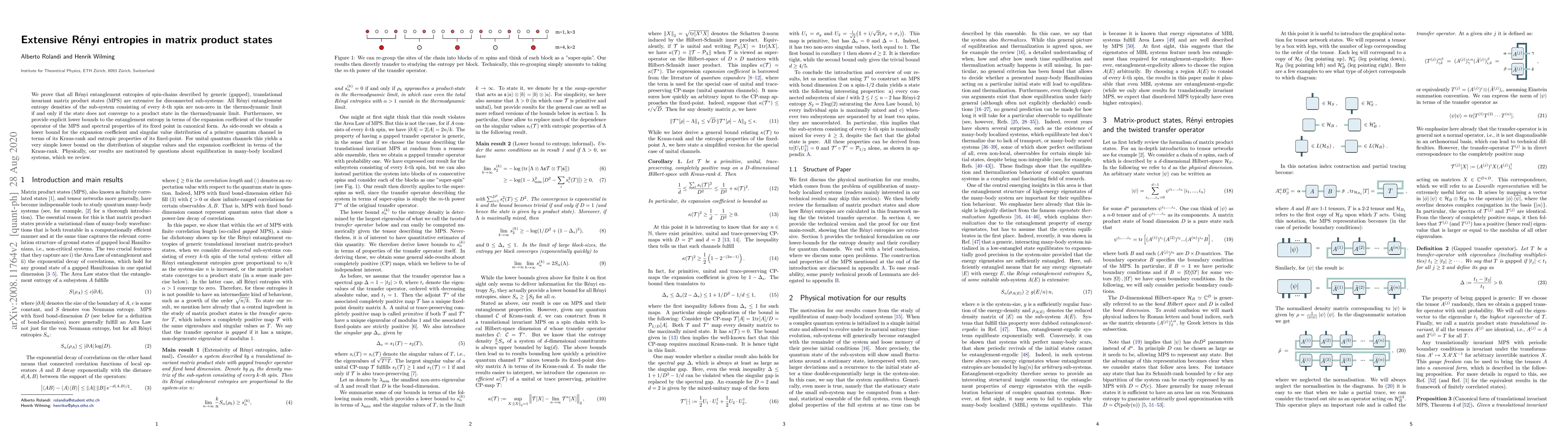 We prove that all R\'enyi entanglement entropies of spin-chains described by generic (gapped), translational invariant matrix product states (MPS) are extensive for disconnected sub-systems: All R\'enyi entanglement entropy densities of the sub-system consisting of every k-th spin are non-zero in the thermodynamic limit if and only if the state does not converge to a product state in the thermodynamic limit. Furthermore, we provide explicit lower bounds to the entanglement entropy in terms of the expansion coefficient of the transfer operator of the MPS and spectral properties of its fixed point in canonical form. As side-result we obtain a lower bound for the expansion coefficient and singular value distribution of a primitve quantum channel in terms of its Kraus-rank and entropic properties of its fixed-point. For unital quantum channels this yields a very simple lower bound on the distribution of singular values and the expansion coefficient in terms of the Kraus-rank. Physically, our results are motivated by questions about equilibration in many-body localized systems, which we review.
