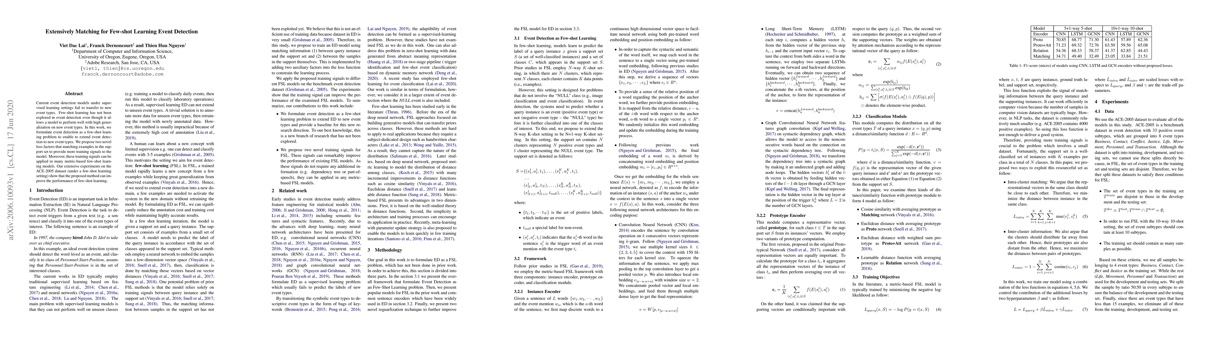 This paper proposes a few-shot learning approach for event detection, introducing novel loss factors to enhance the matching of examples in the support set, thereby improving performance on the ACE-2005 dataset under few-shot conditions. The method aims to better generalize to new event types.